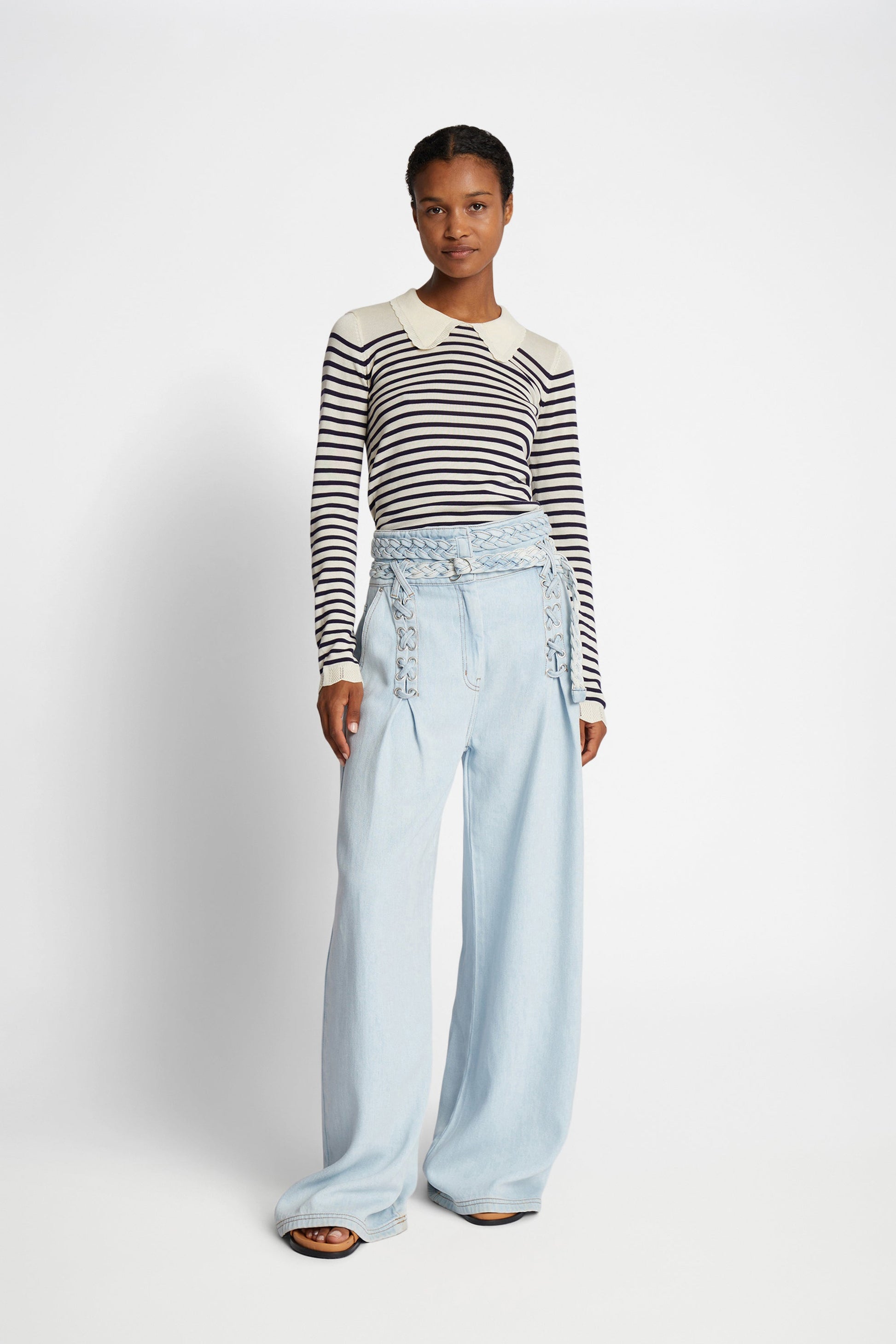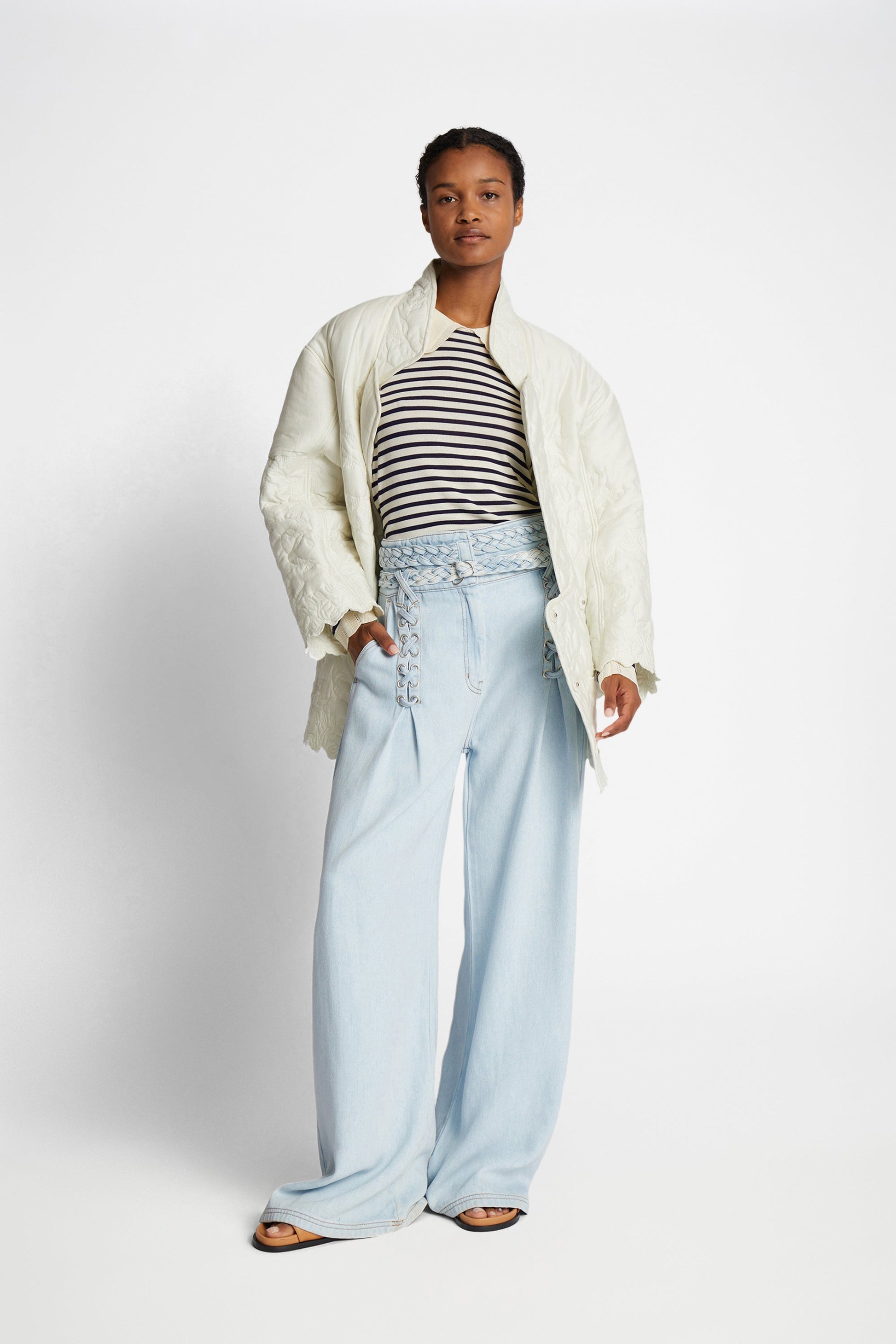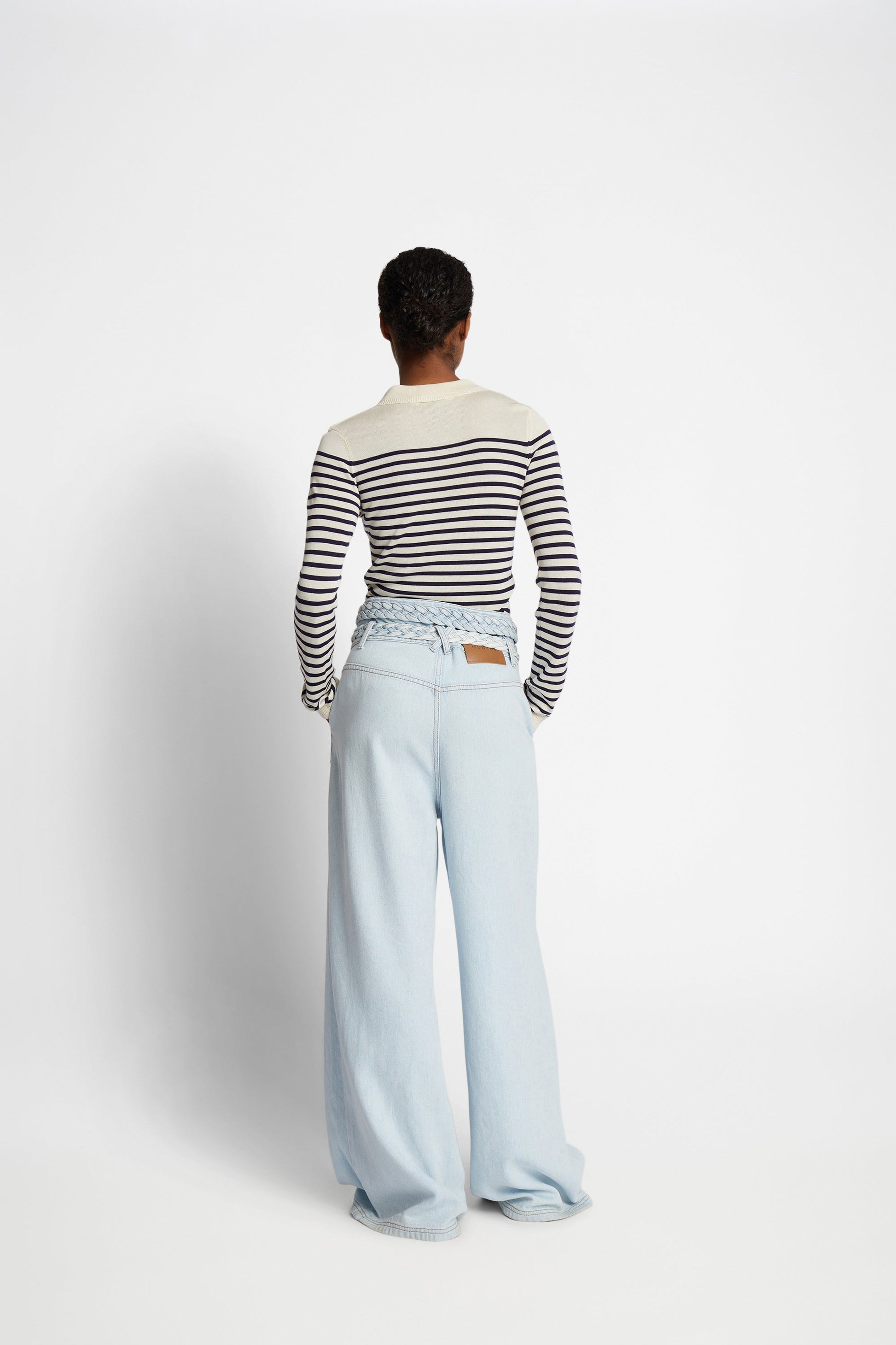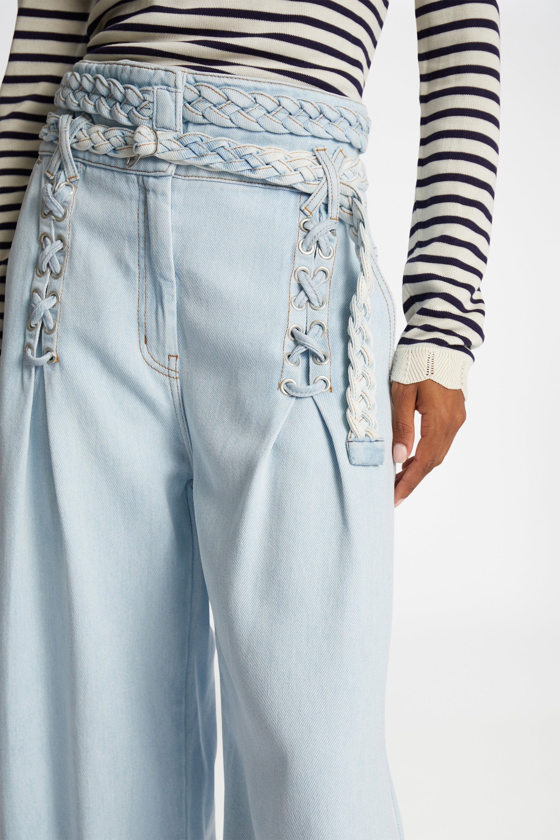 Jeans med en vacker flätad detalj i midjan och en unik knytbandsdetalj längs höfterna. Designade med hög midja, vida ben och sidfickor, kombinerar detta par statement-design med vardaglig komfort.