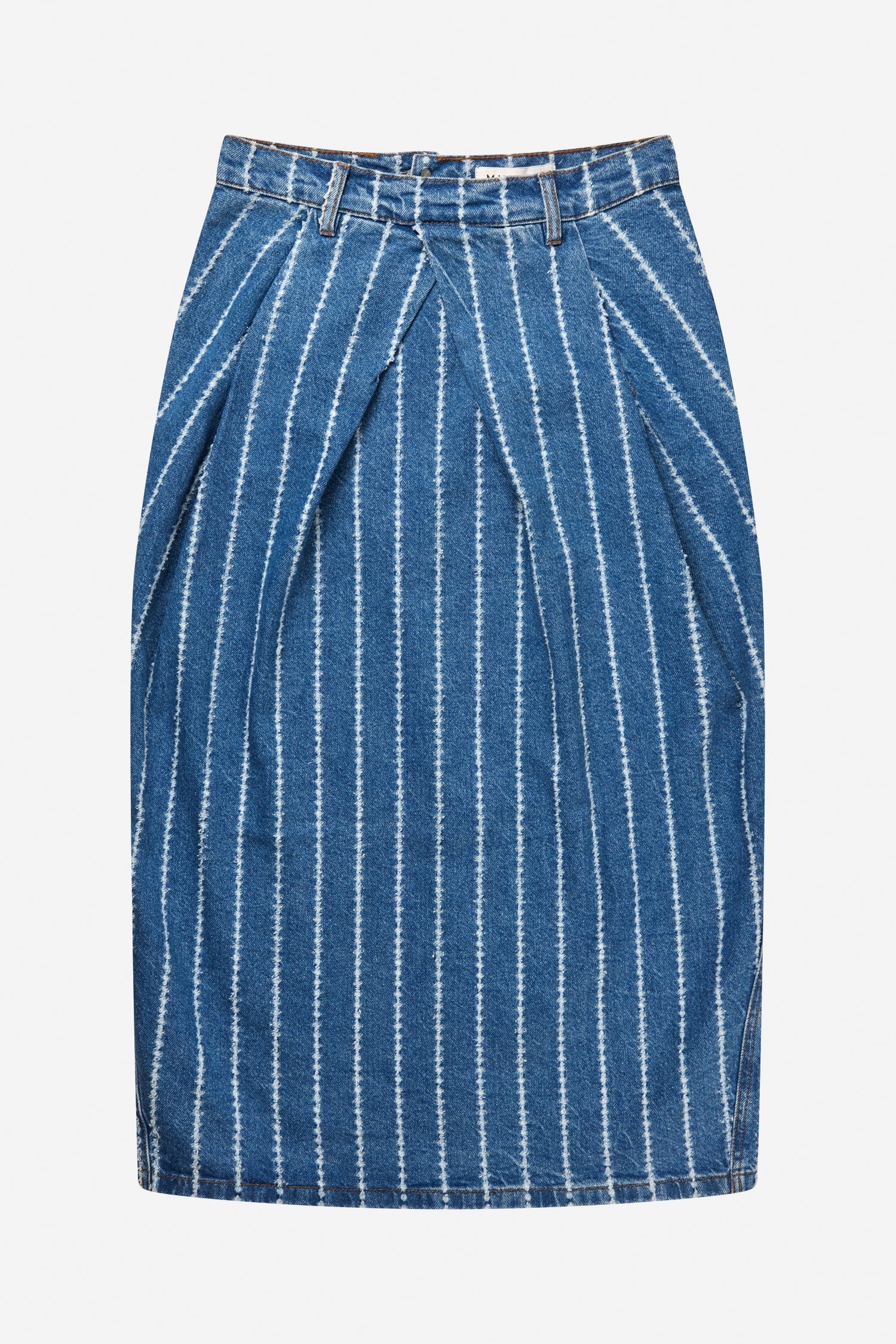Vacker denimkjol med kritstrecksrandig passform och breda skulpturala veck framtill för extra volym och struktur. Designad med normal passform, dragkedja bak och funktionella sidofickor, blandar detta plagg skräddarsydda detaljer med vardaglig bekvämlighet.