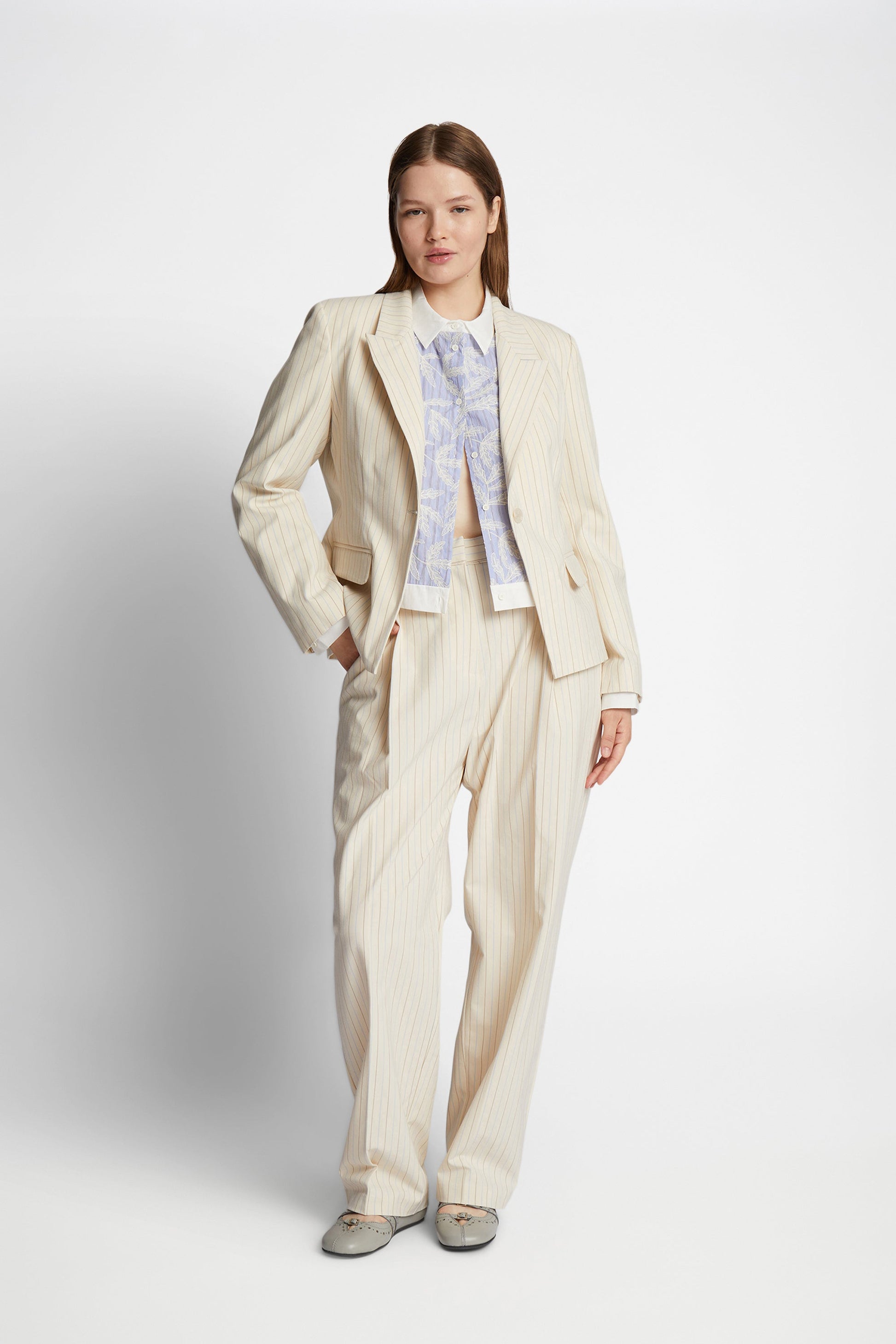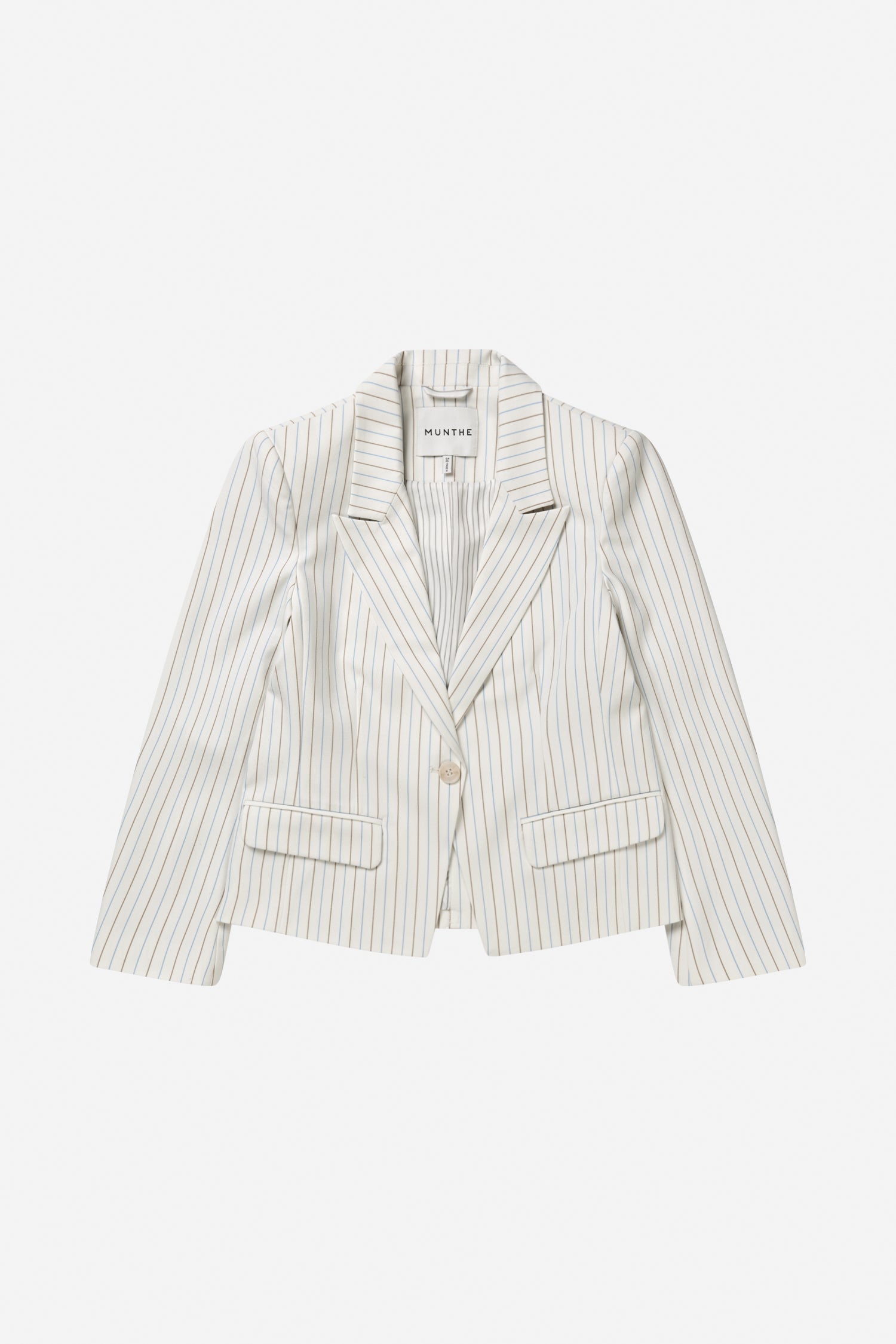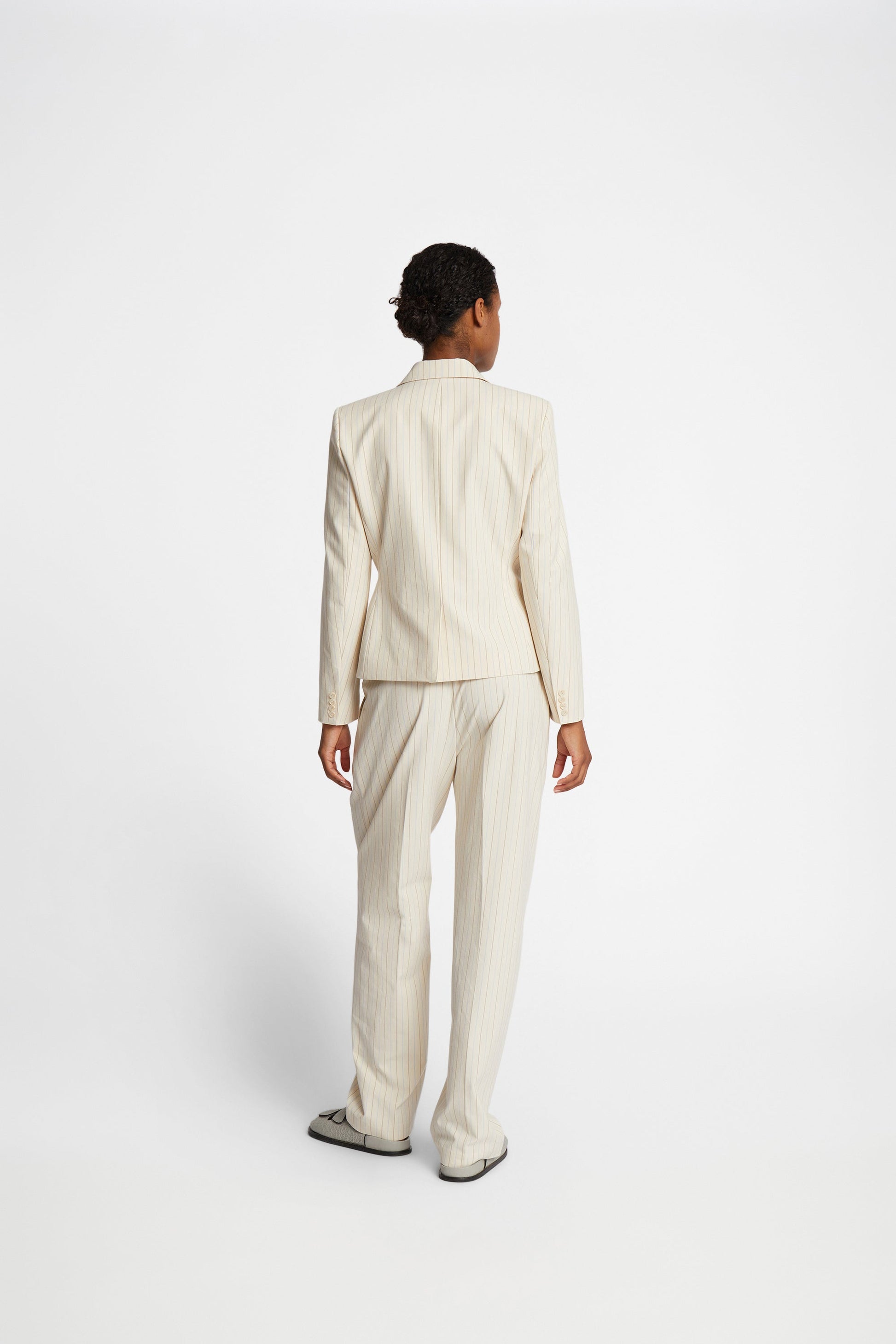 Kort, figurnära kavaj med eleganta blå och röda kritstreck. Designad med raka axlar och långa ärmar, stängning med en enda knapp och klassiska fickor med lock för en elegant, strukturerad look. Ett tidlöst plagg med en skarp silhuett.
