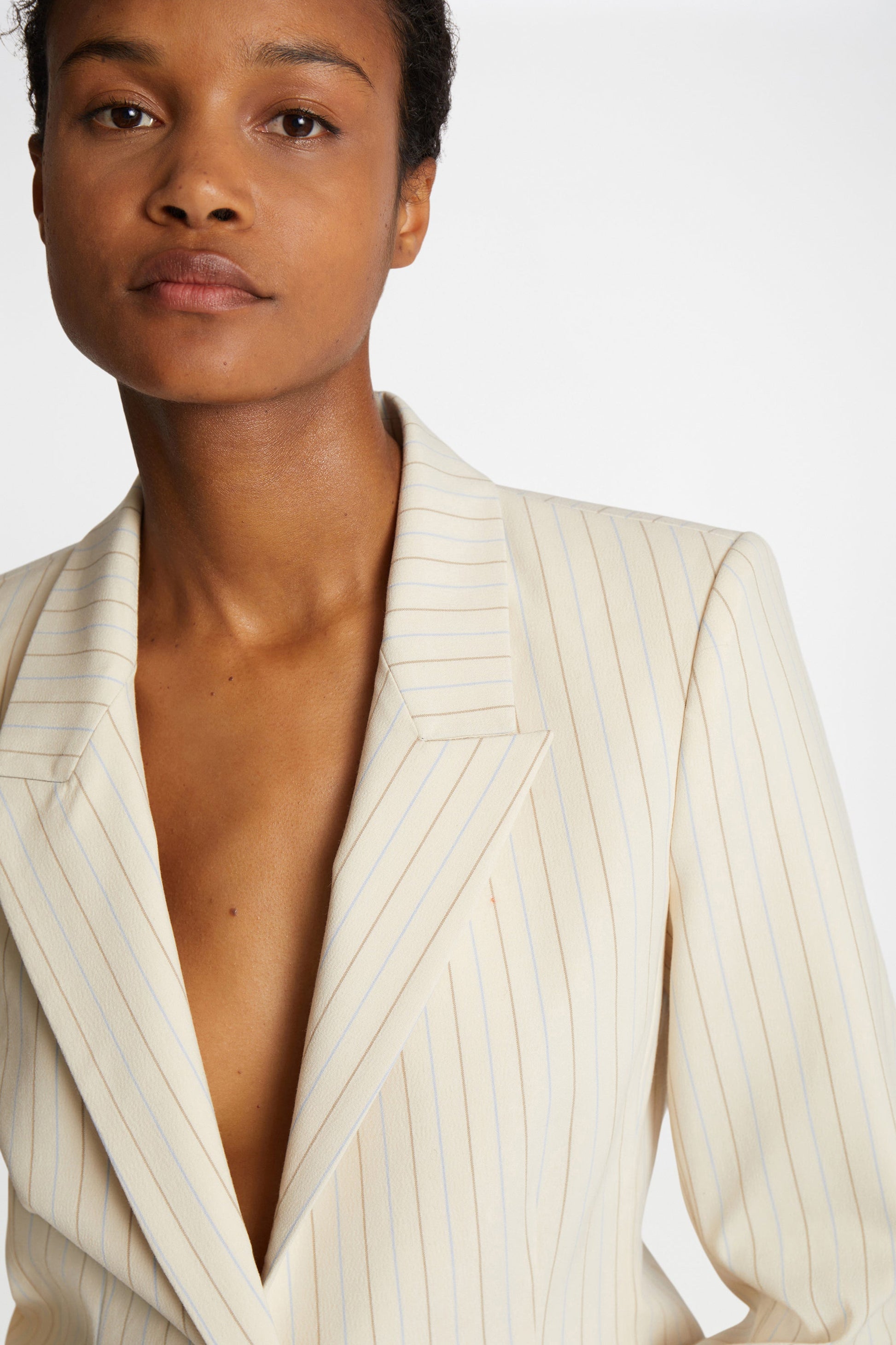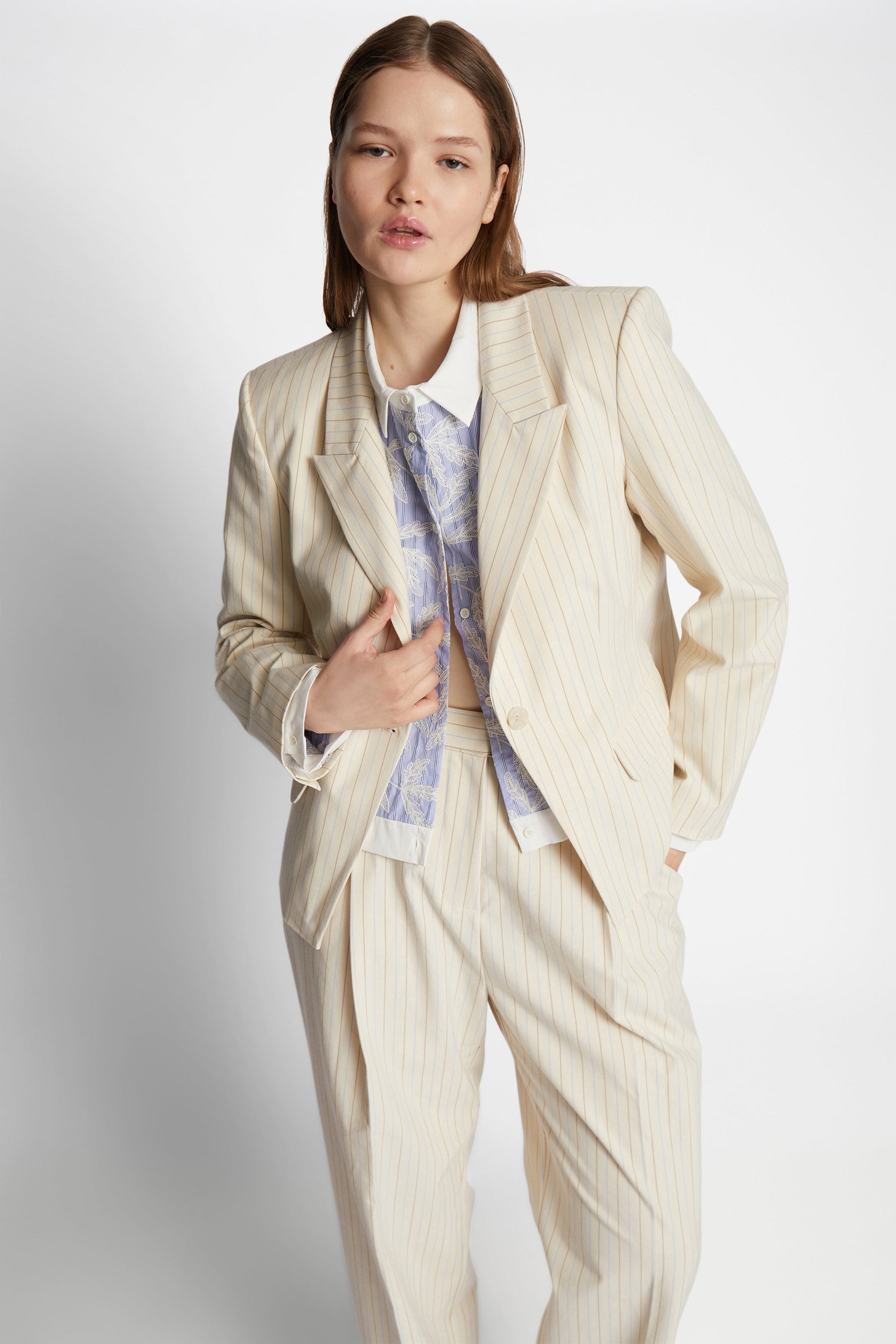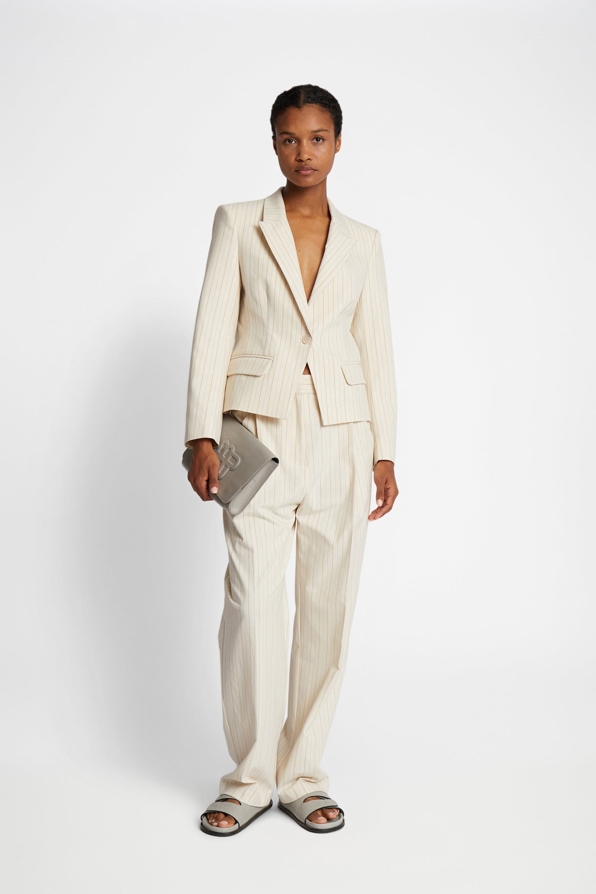 Kort, figurnära kavaj med eleganta blå och röda kritstreck. Designad med raka axlar och långa ärmar, stängning med en enda knapp och klassiska fickor med lock för en elegant, strukturerad look. Ett tidlöst plagg med en skarp silhuett.