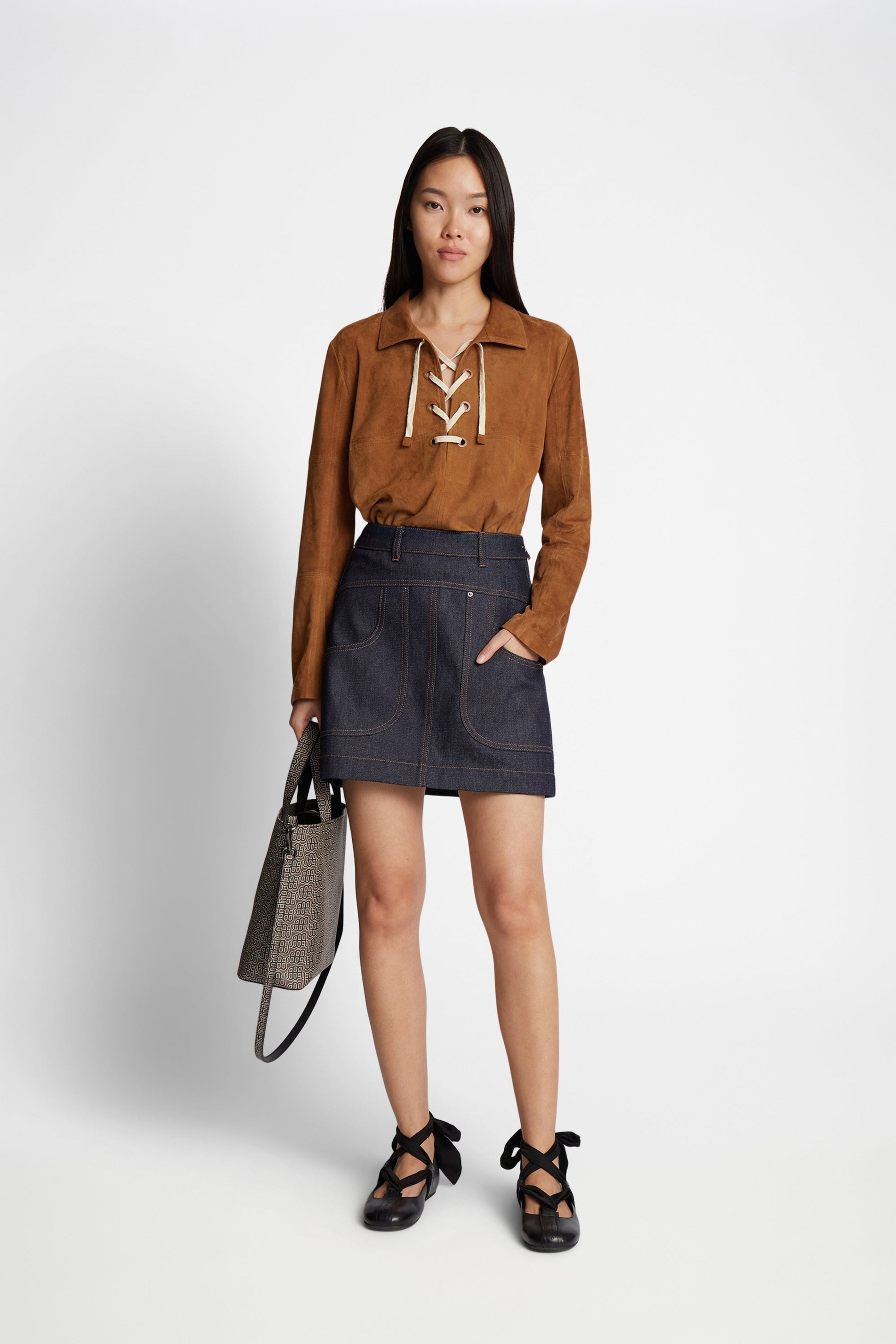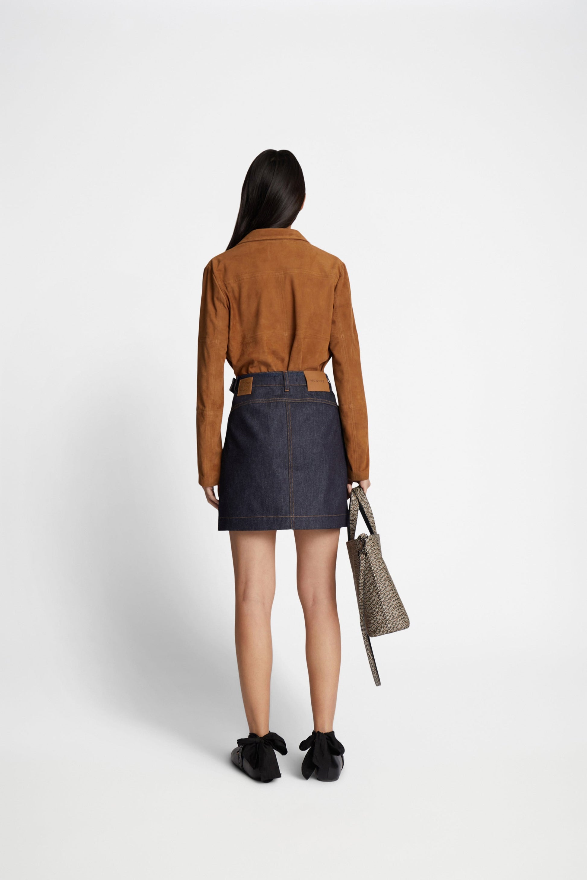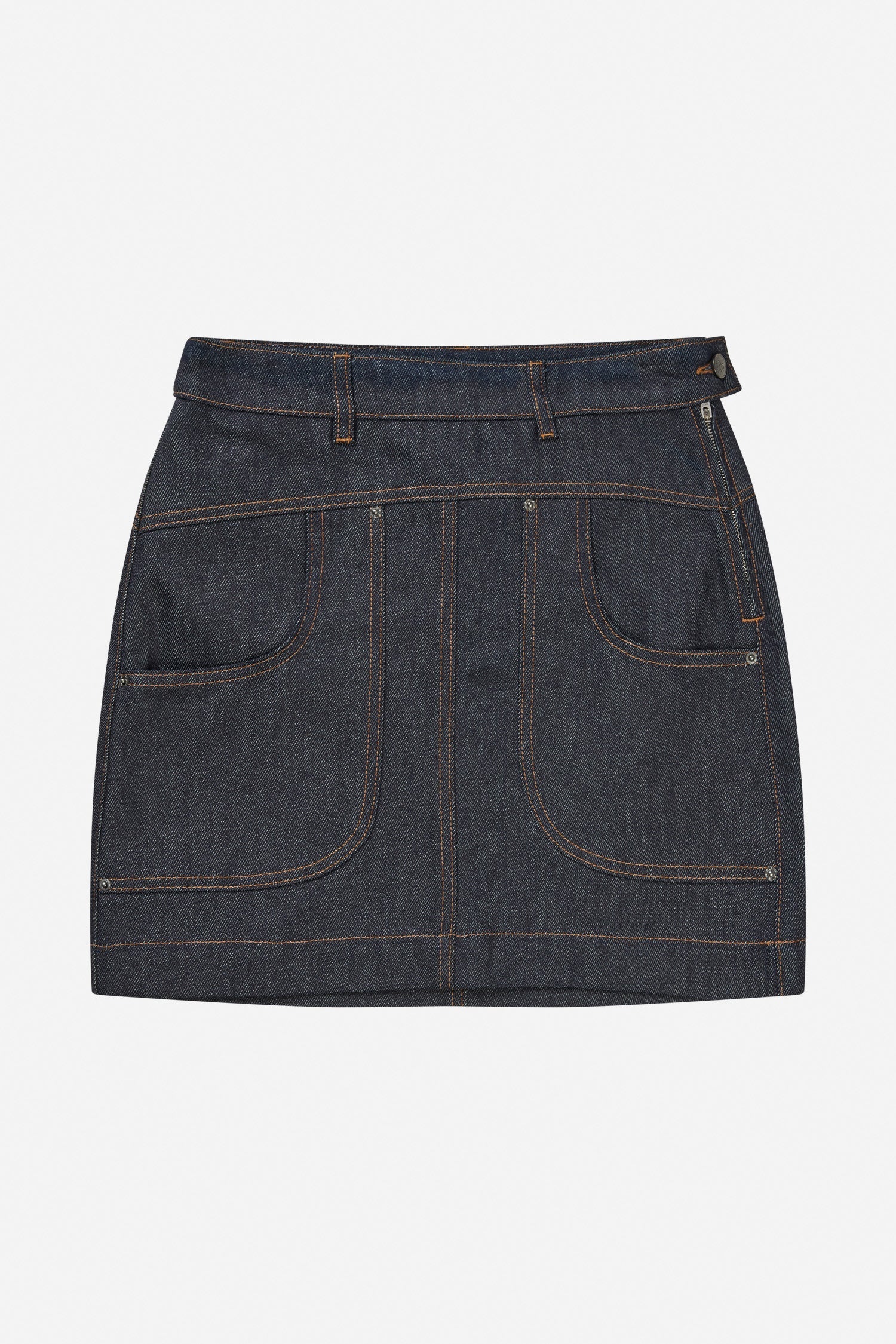 Elegant kort denimkjol med överdimensionerade framfickor och en åtsittande silhuett. Detta plagg har en knapp- och dragkedja och erbjuder en ren, strukturerad look i en klassisk indigotvätt.