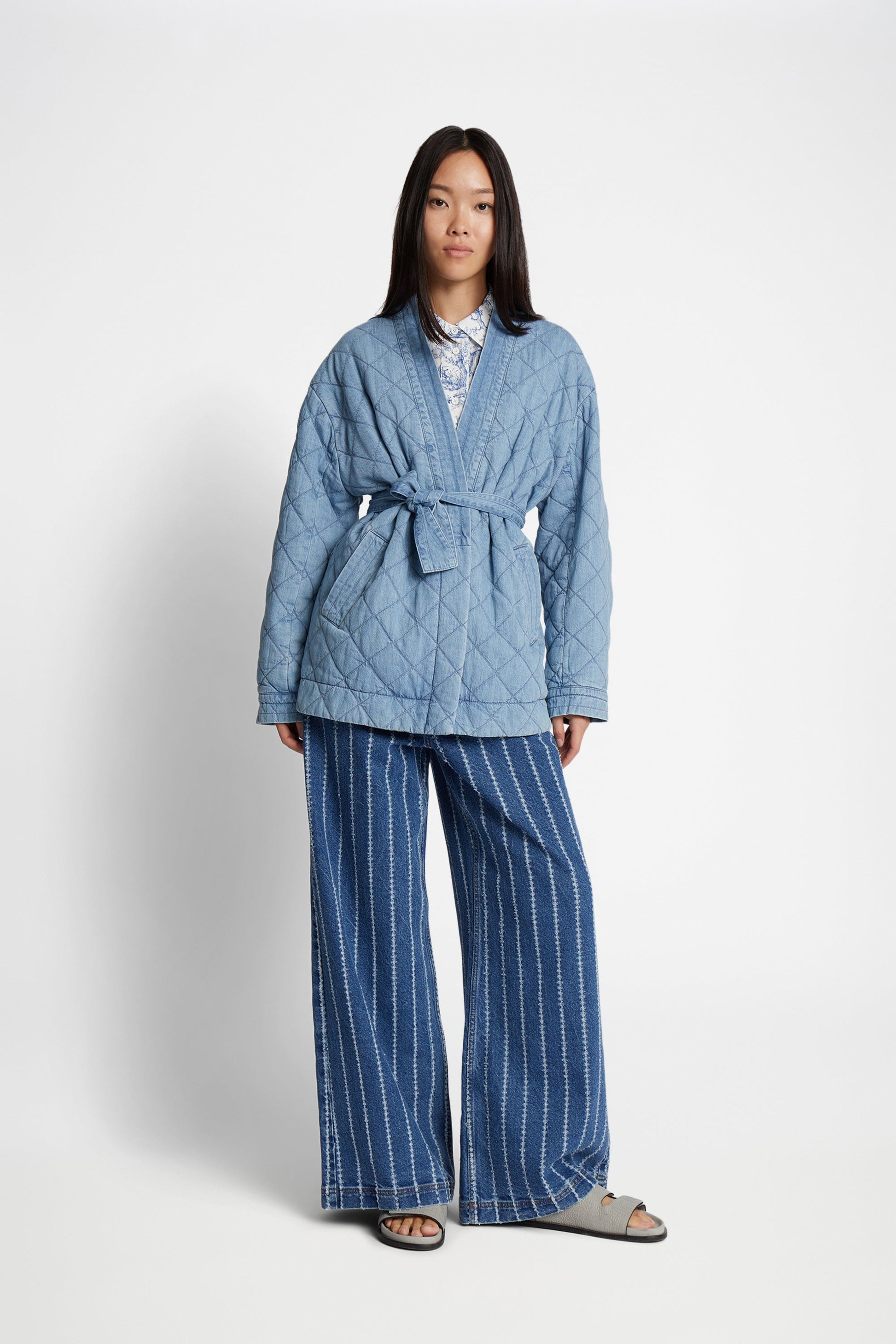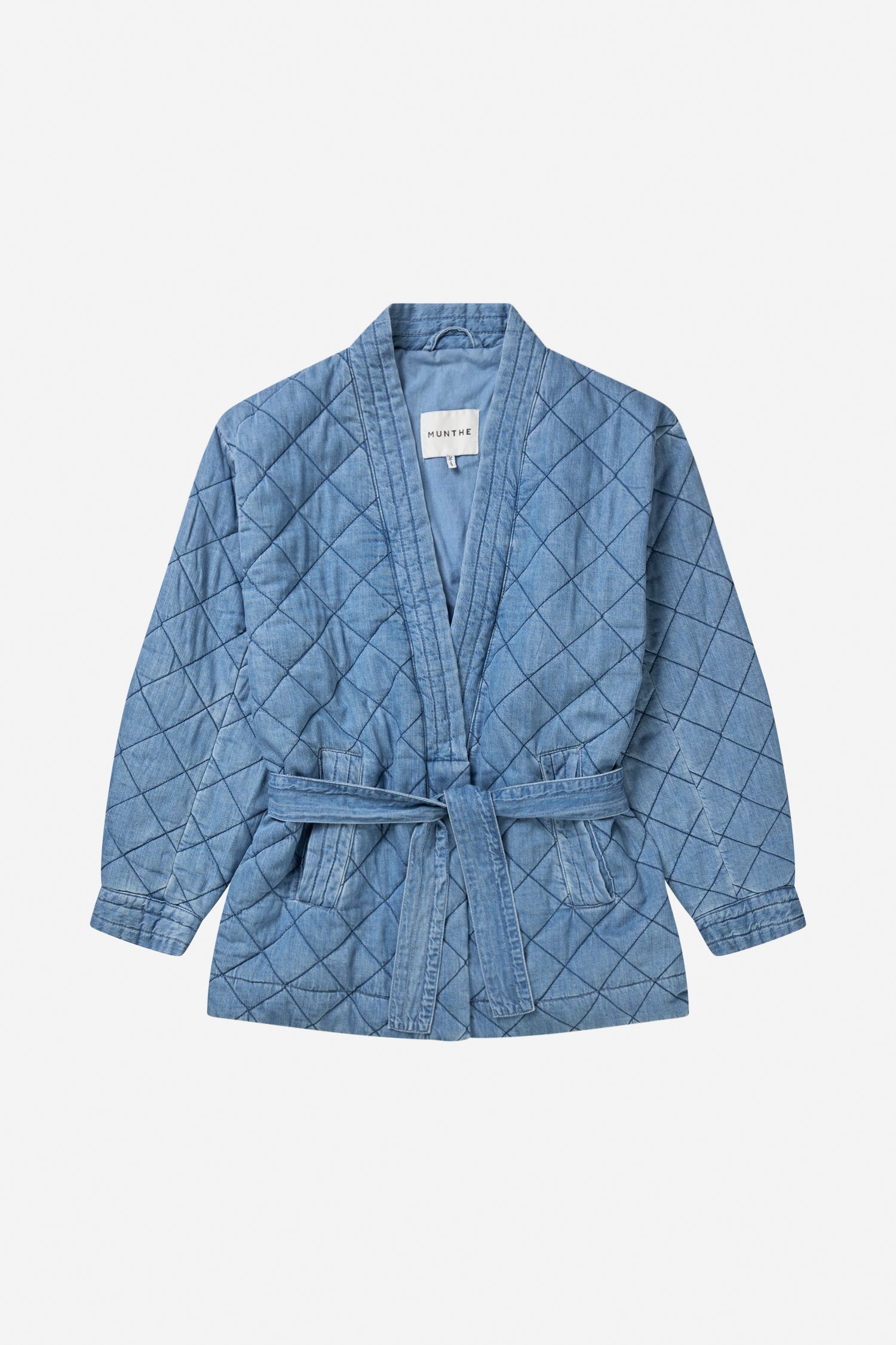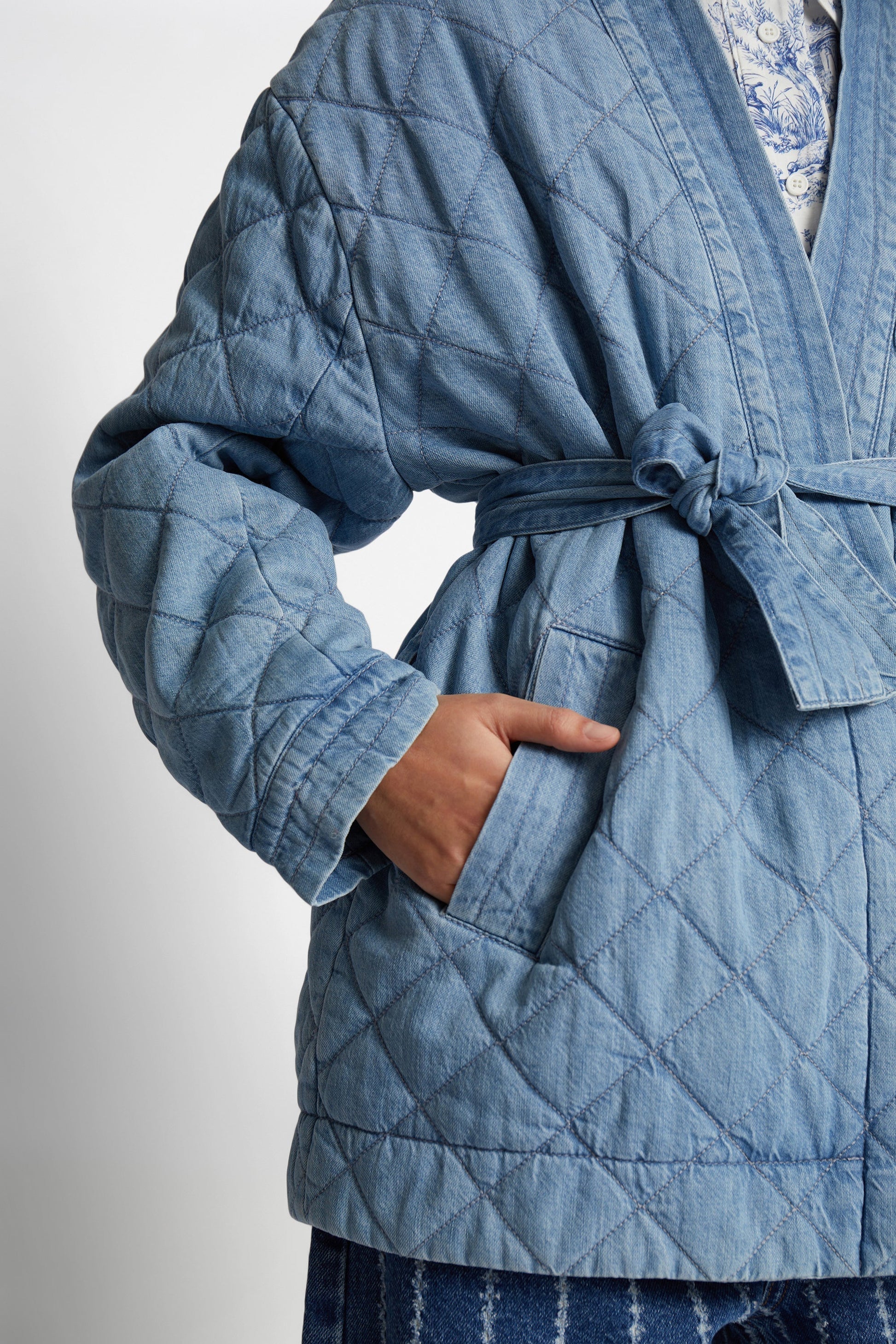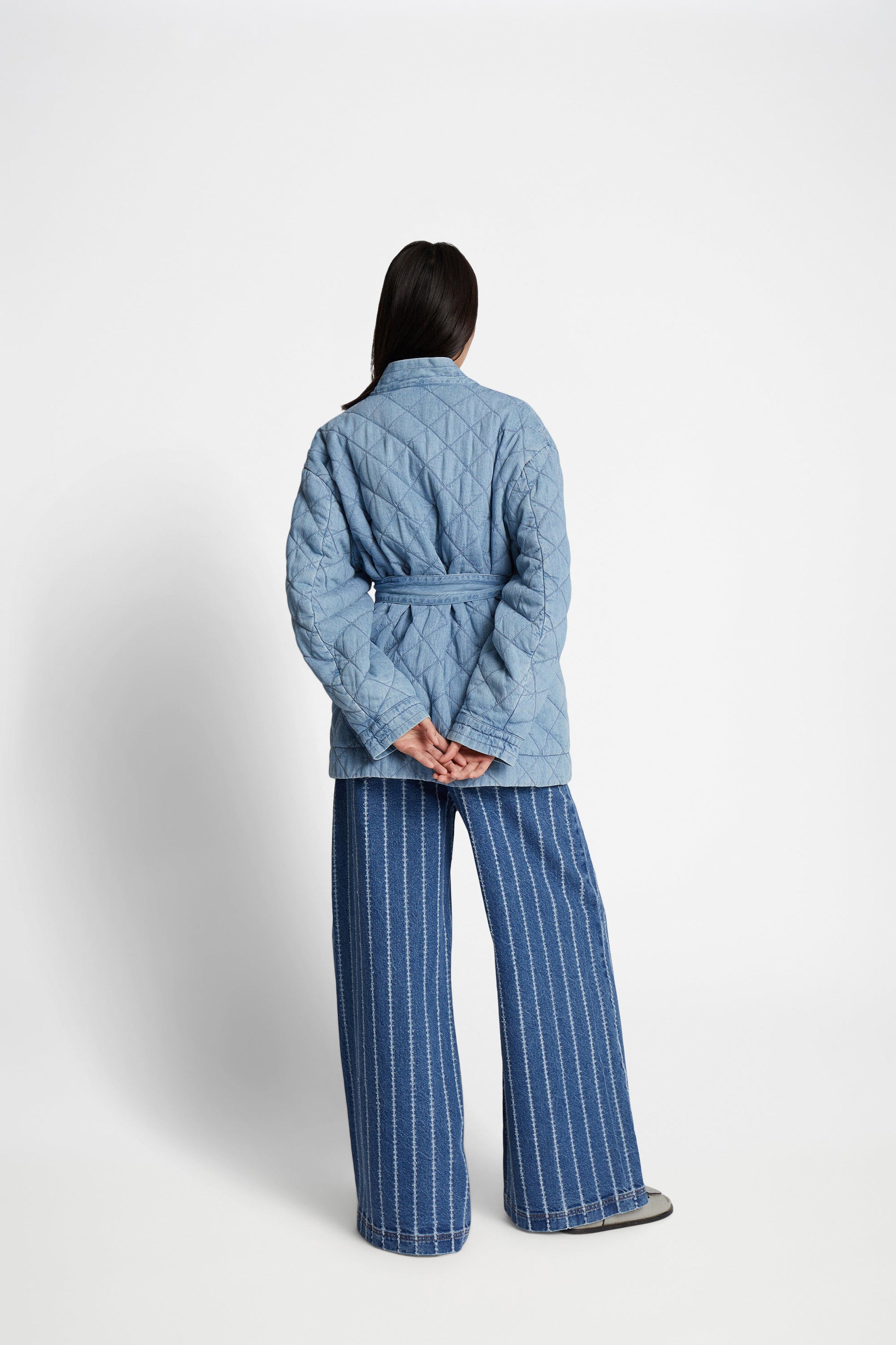 Elegant quiltad jeansjacka med halvvida ärmar, en smickrande skärp i midjan och praktiska sidofickor. Jackan är designad för en lös passform och har ett avtagbart skärp för justerbar form och ökad mångsidighet. En modern version av en tidlös silhuett.