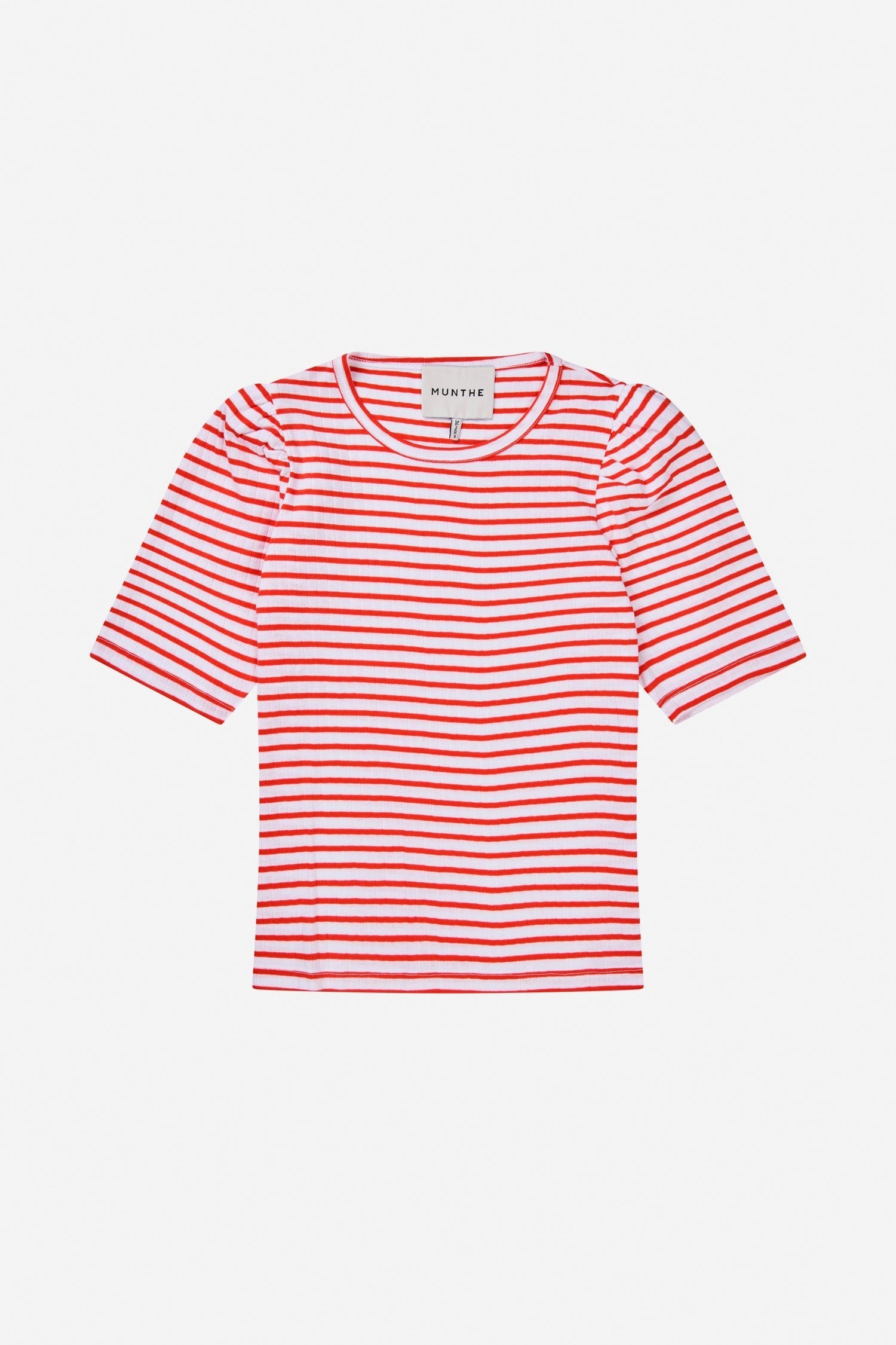 Randig t-shirt med lätta, eleganta puffärmar och låg axelsöm för en avslappnad silhuett. Tillverkad av 100 % ekologisk bomull och rund halsringning, blandar detta plagg vardagskomfort med en feminin touch.