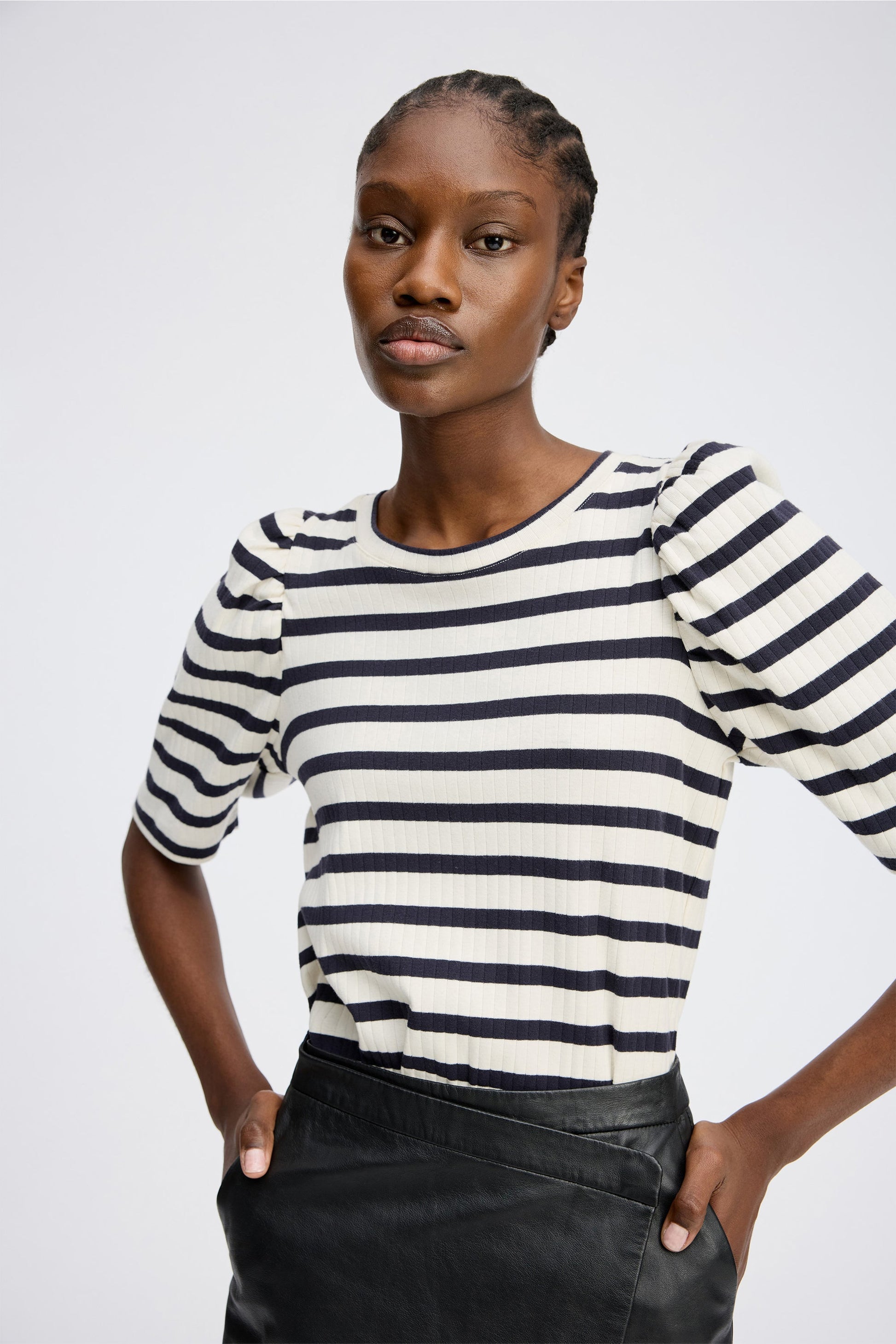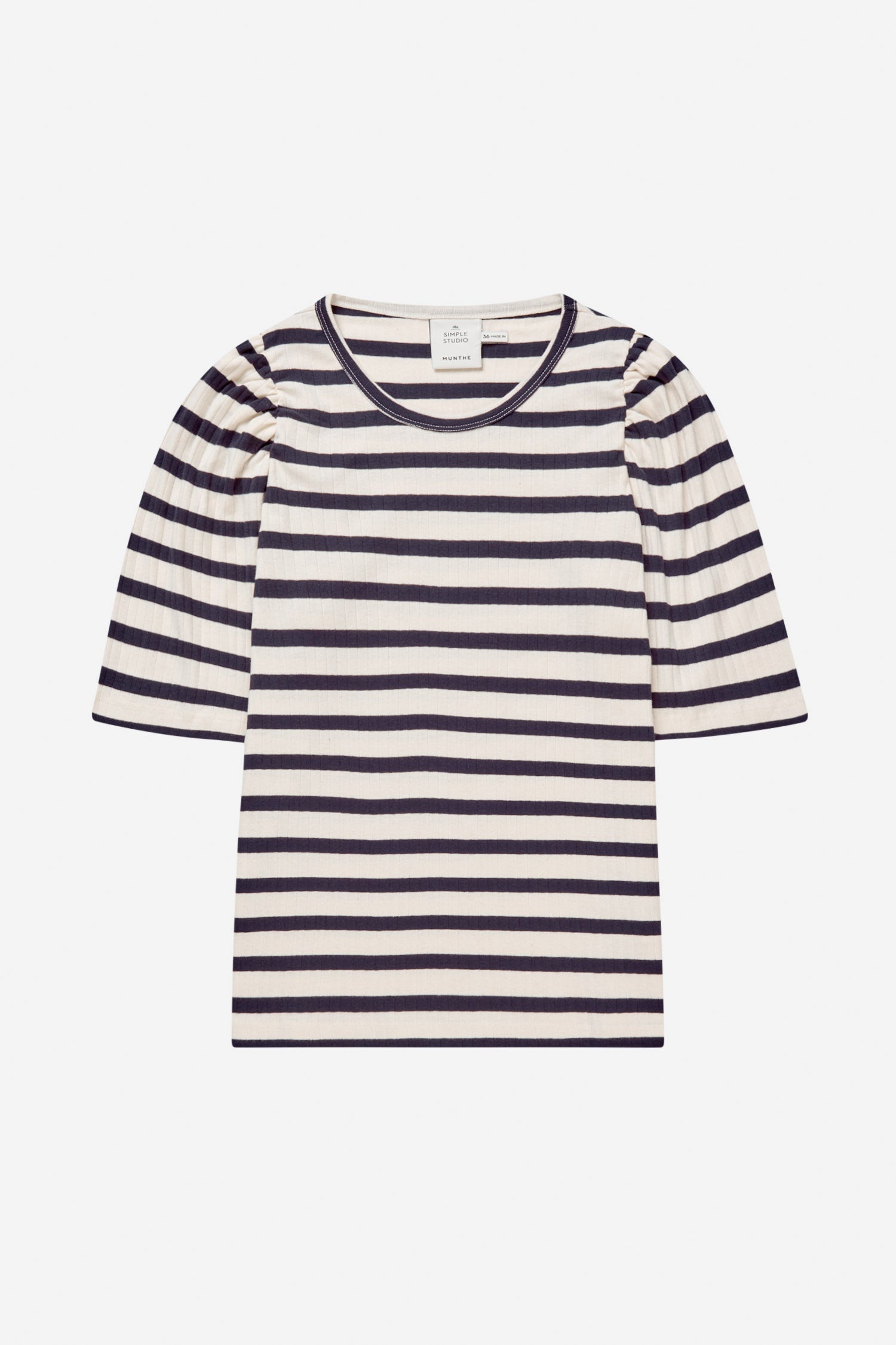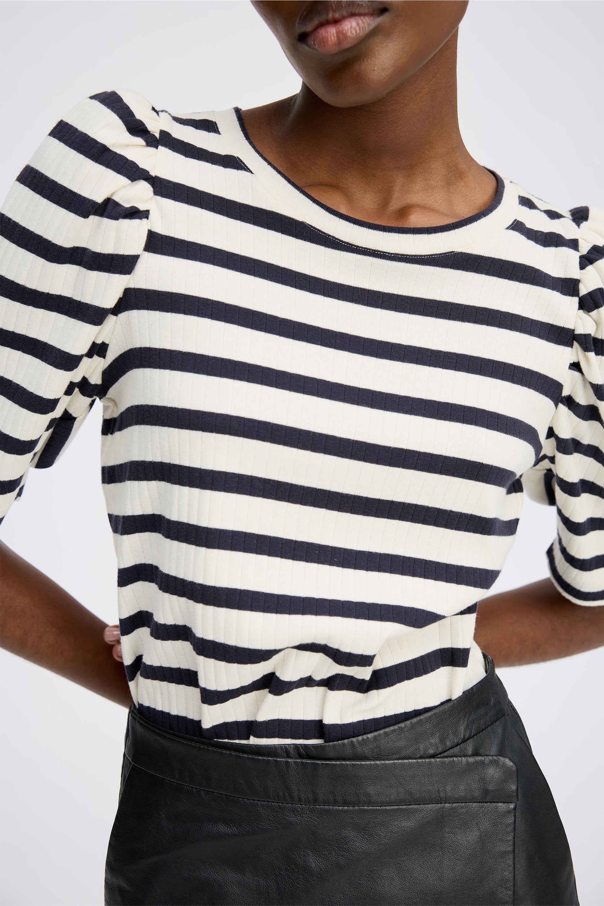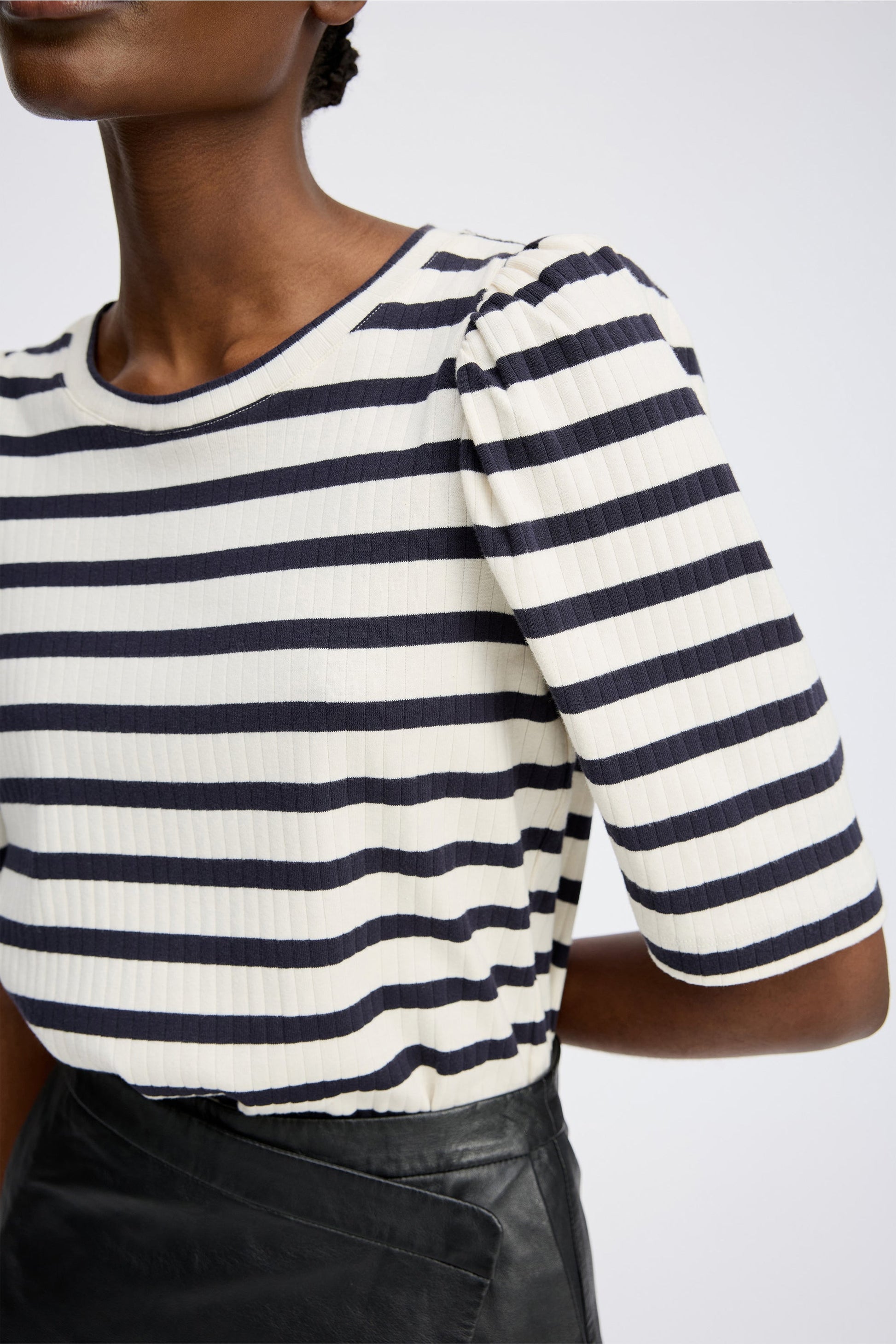 Randig, figurnära t-shirt tillverkad av 100 % ekologisk bomull med lätta puffärmar, rund halsringning och låg axelsöm för en mjuk och feminin silhuett. Ett bekvämt plagg med subtila detaljer.
