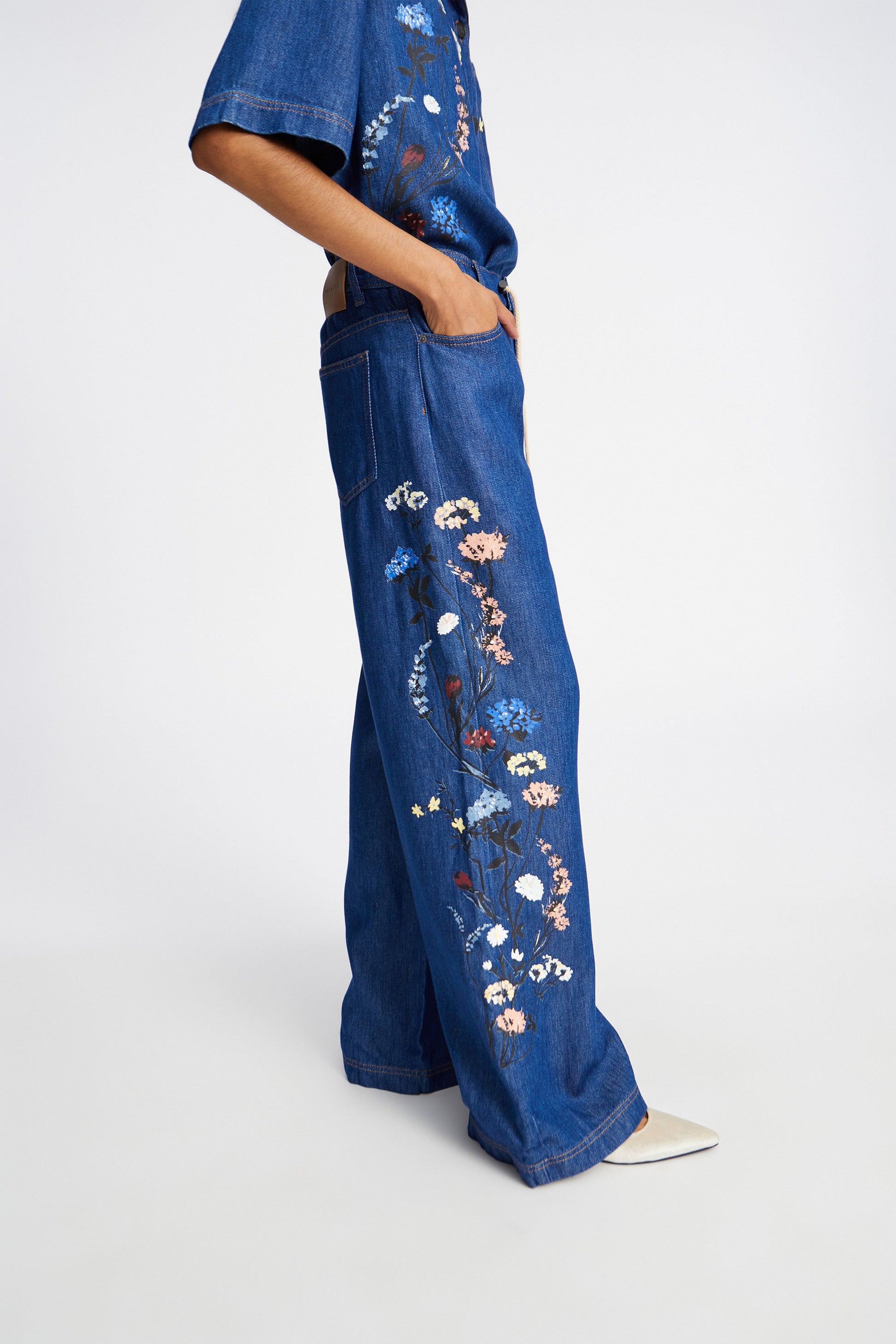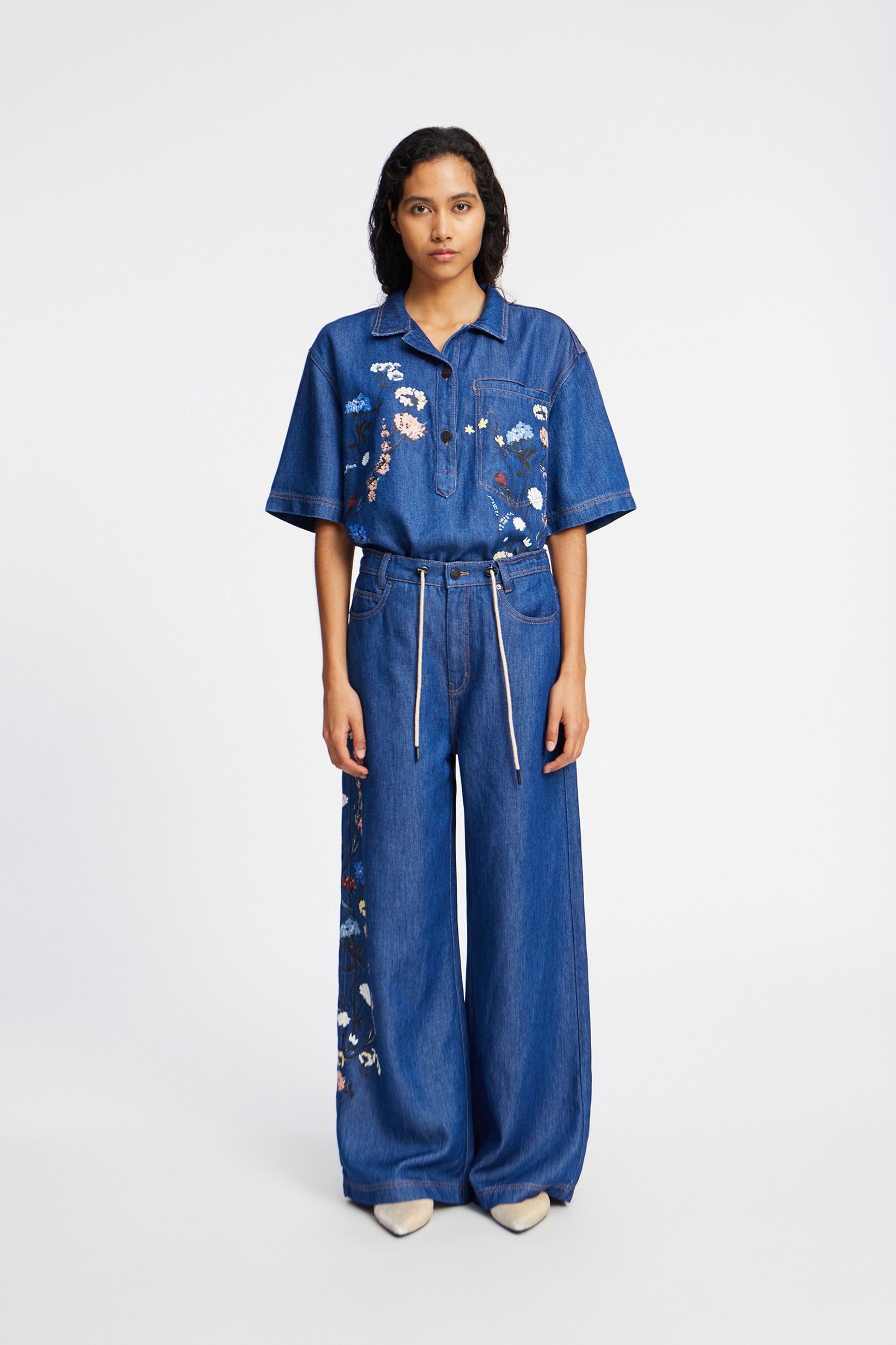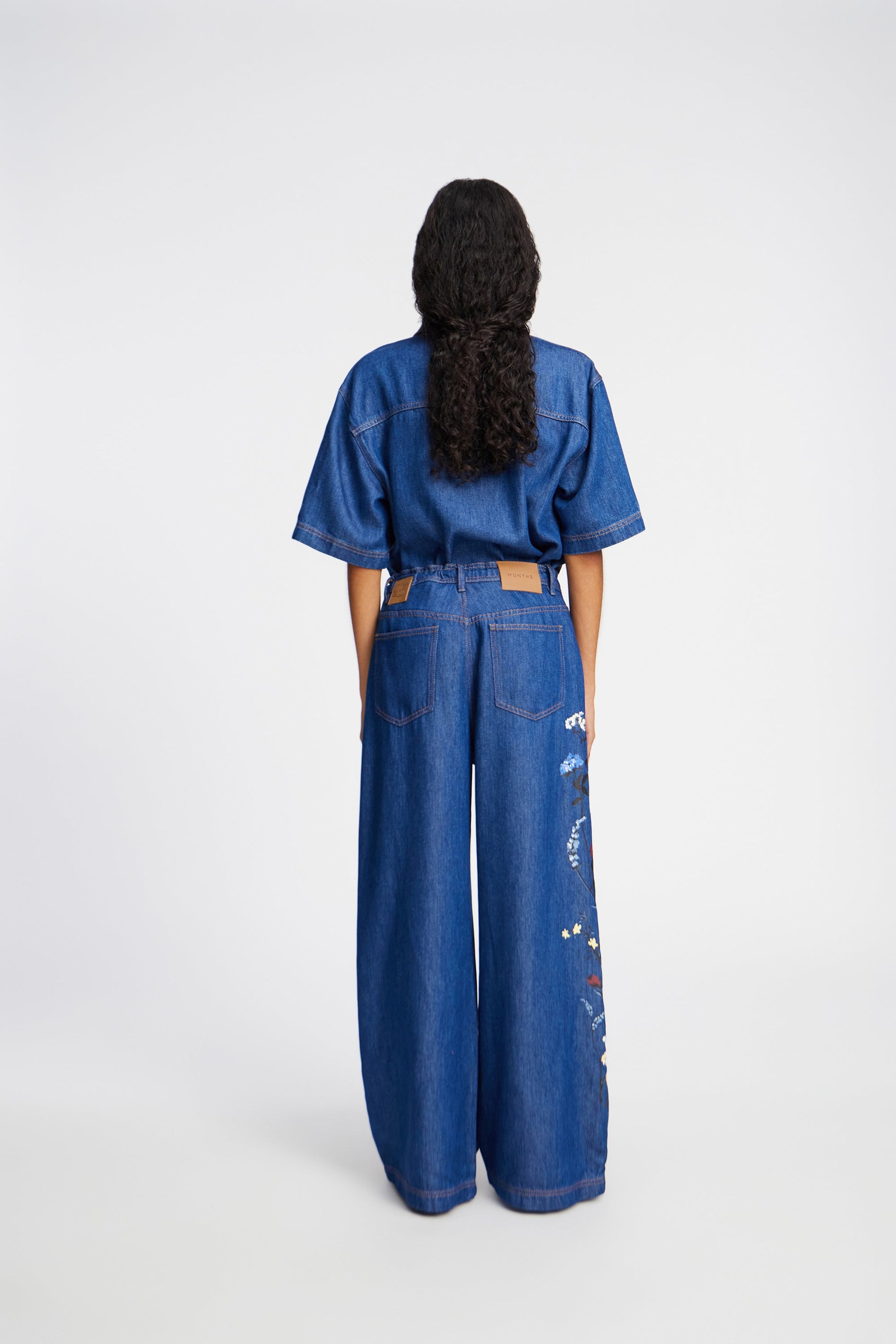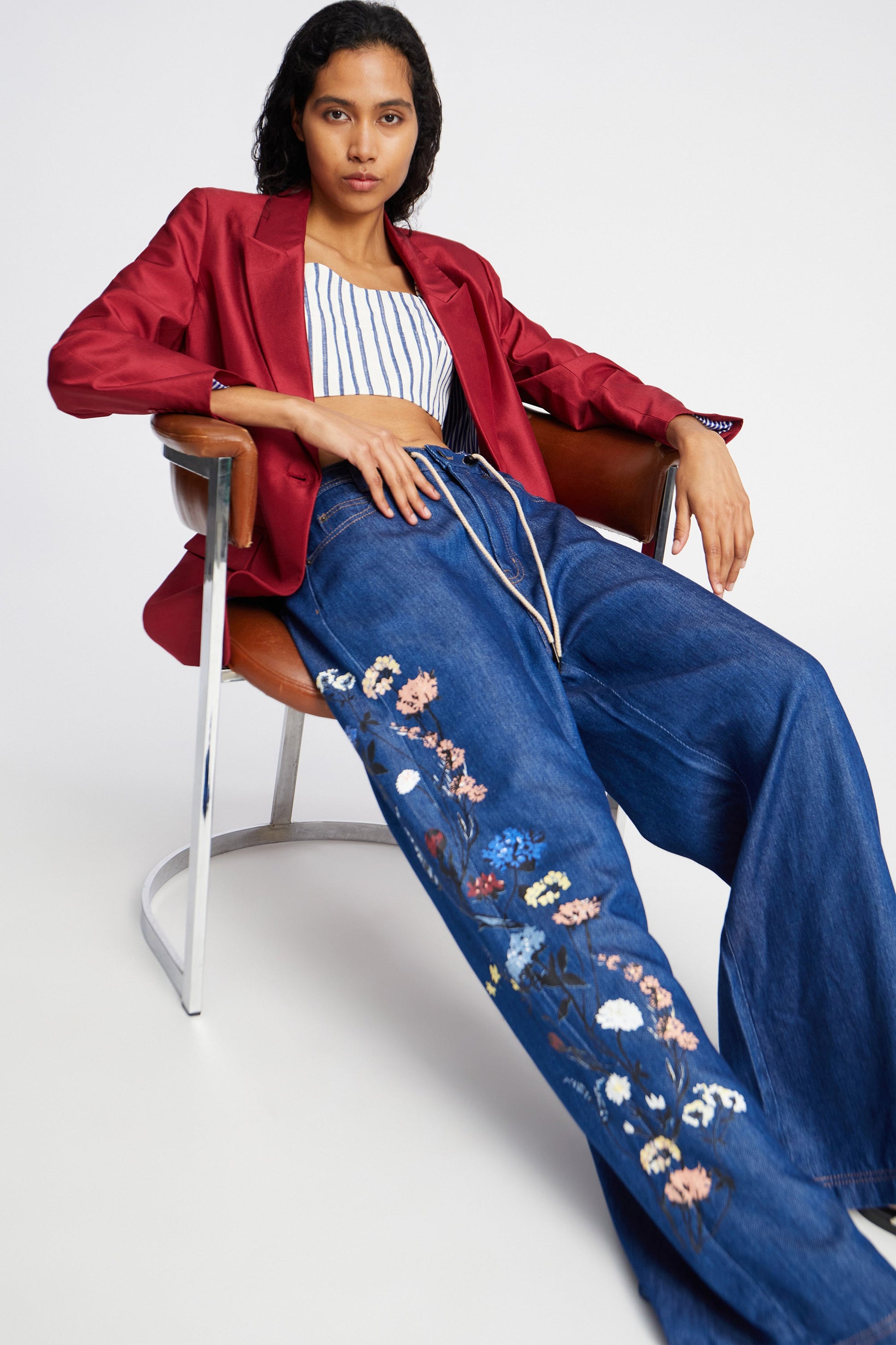 Mörkblå jeans med ett vackert blommönster, designade med en lös passform, vida ben och elegant dragskodetalj i midjan. Dessa jeans har fickor fram och bak och blandar avslappnad komfort med konstnärlig stil.