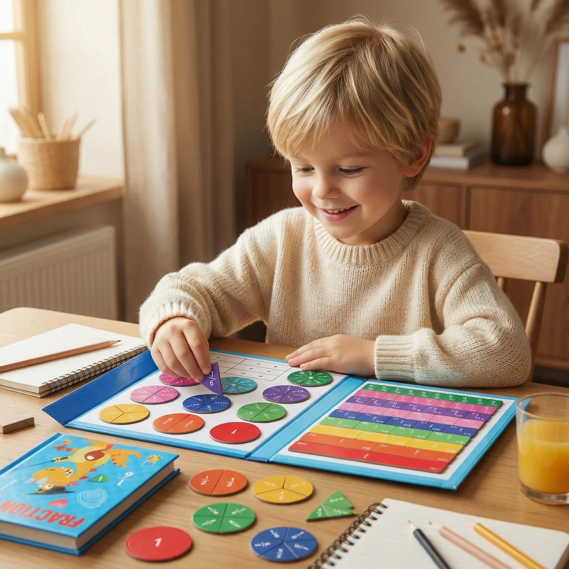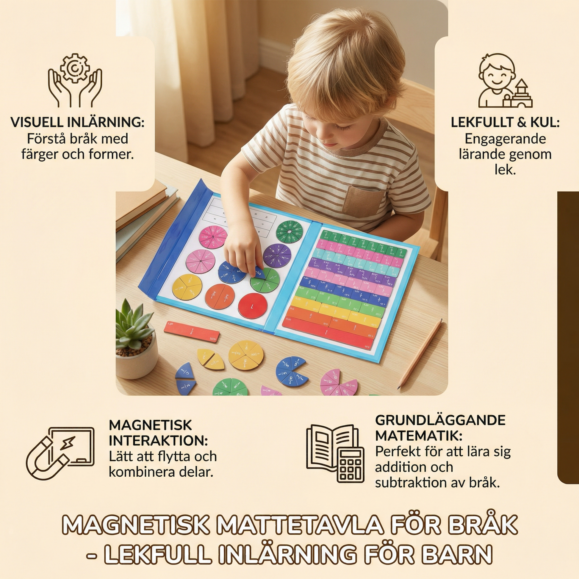 Att förstå bråk behöver varken vara svårt eller tråkigt. Den magnetiska bråkinlärningstavlan för barn gör matematik till en lekfull och praktisk upplevelse fylld av färg, rörelse och nyfikenhet. Med sin tydliga design och magnetiska delar hjälper den barn att greppa både bråk och räkneoperationer på ett naturligt sätt – samtidigt som självförtroendet i matematik växer steg för steg.