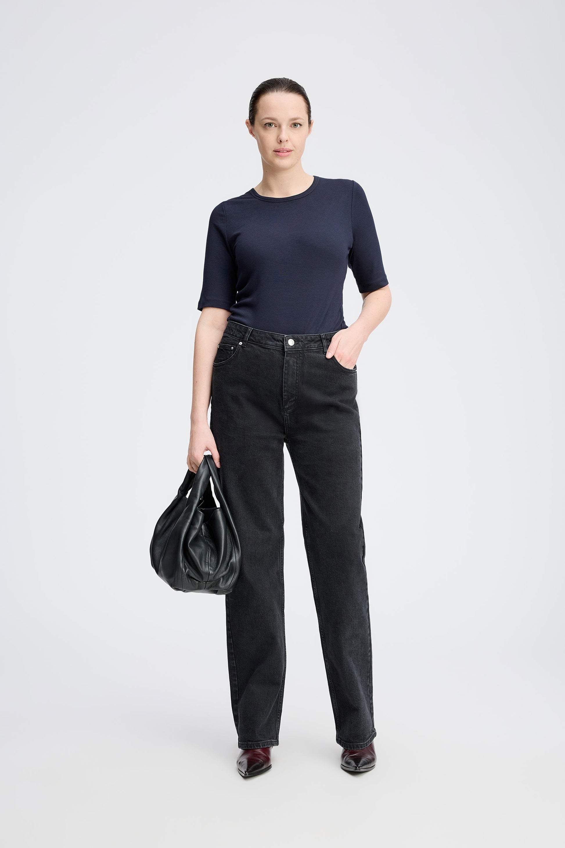 T-shirt med armbågslånga ärmar, tillverkad av en mjuk blandning av Ecovero och elastan. Designad för en smal passform med rund halsringning, erbjuder detta plagg vardagskomfort med en slät, smickrande silhuett.