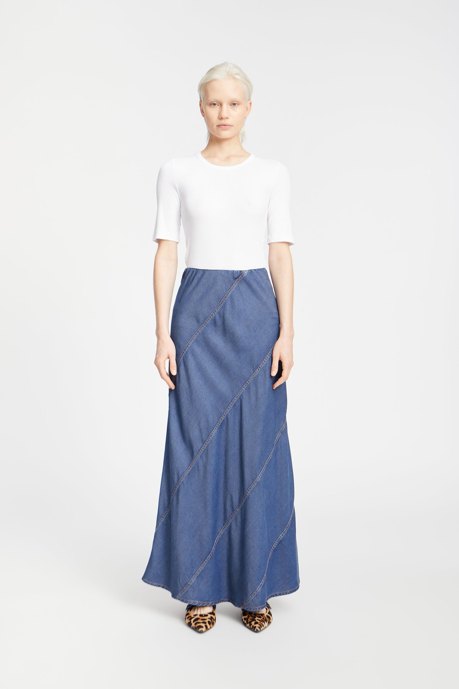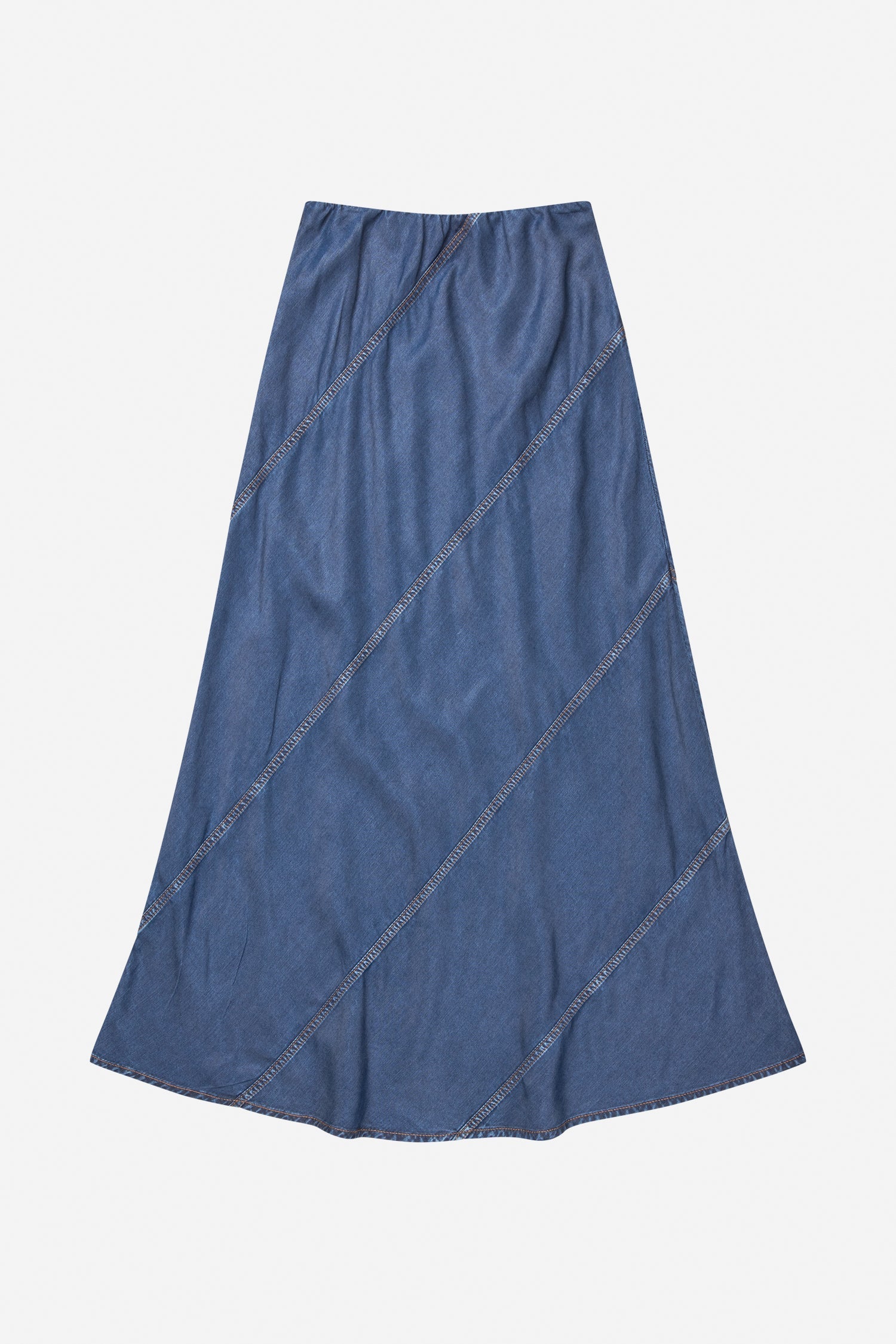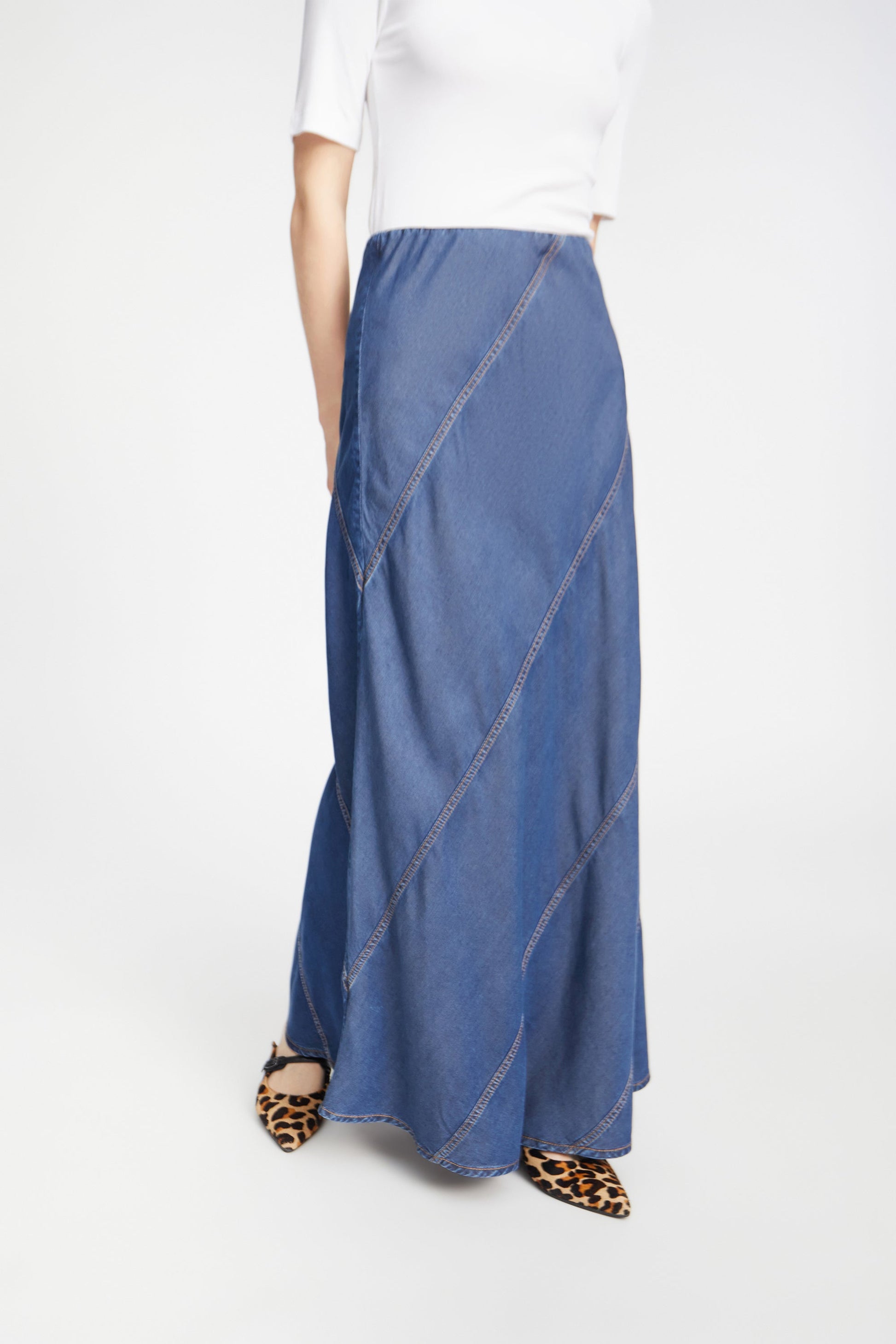 Vacker lång denimkjol med eleganta diagonala sömmar och en ren, minimalistisk silhuett. Designad med en resår i midjan för komfort och avslappning, är det ett tidlöst plagg med subtila detaljer.