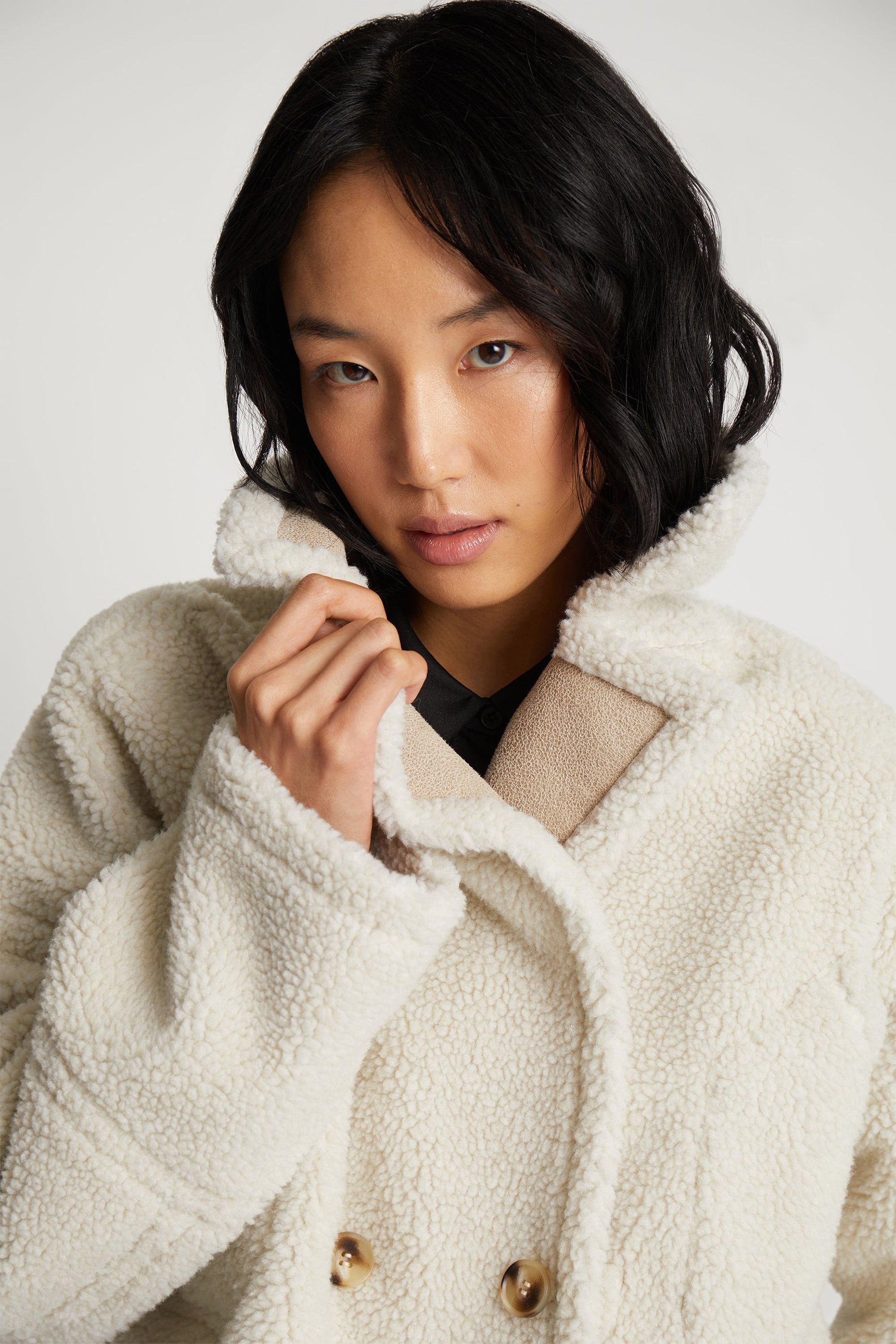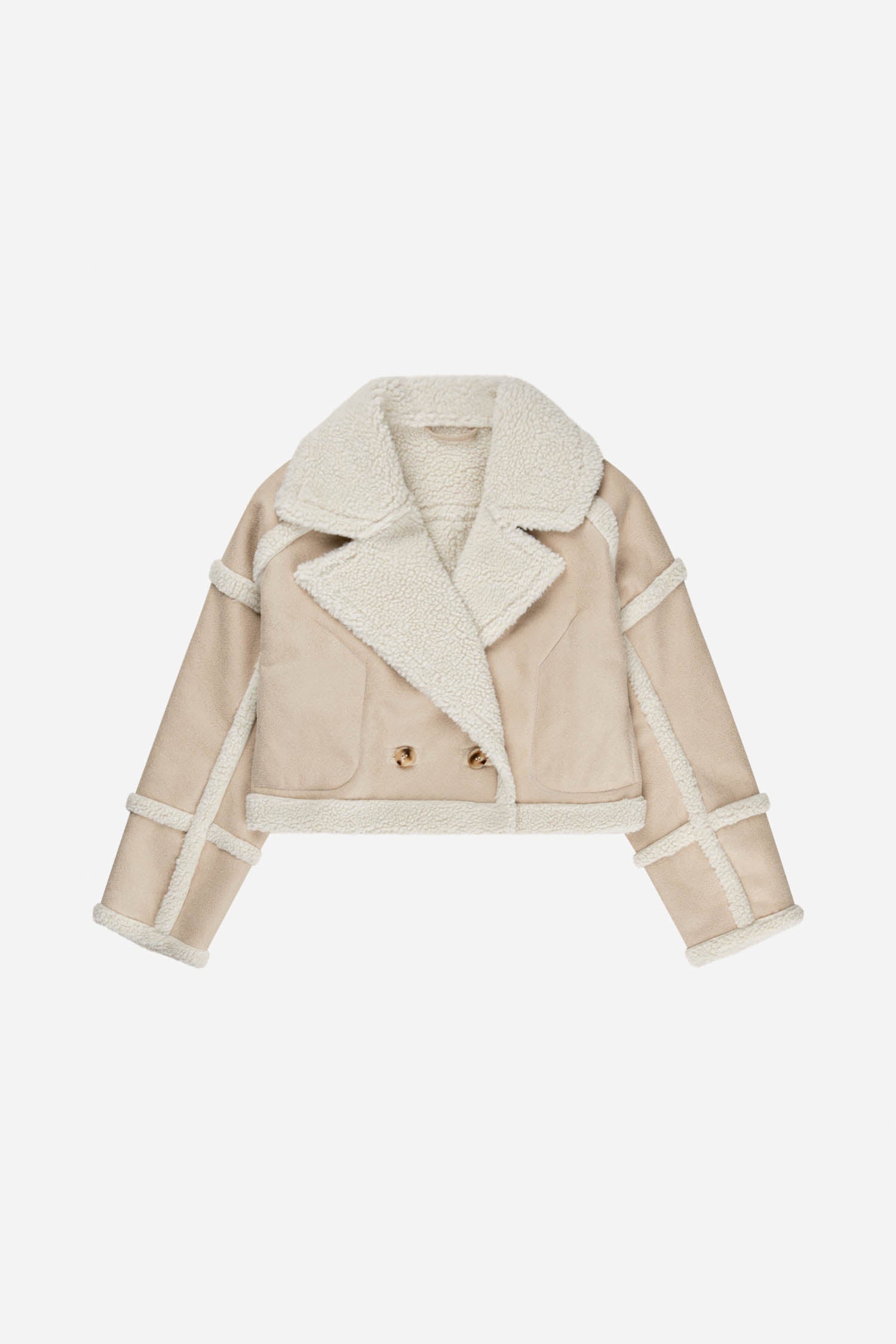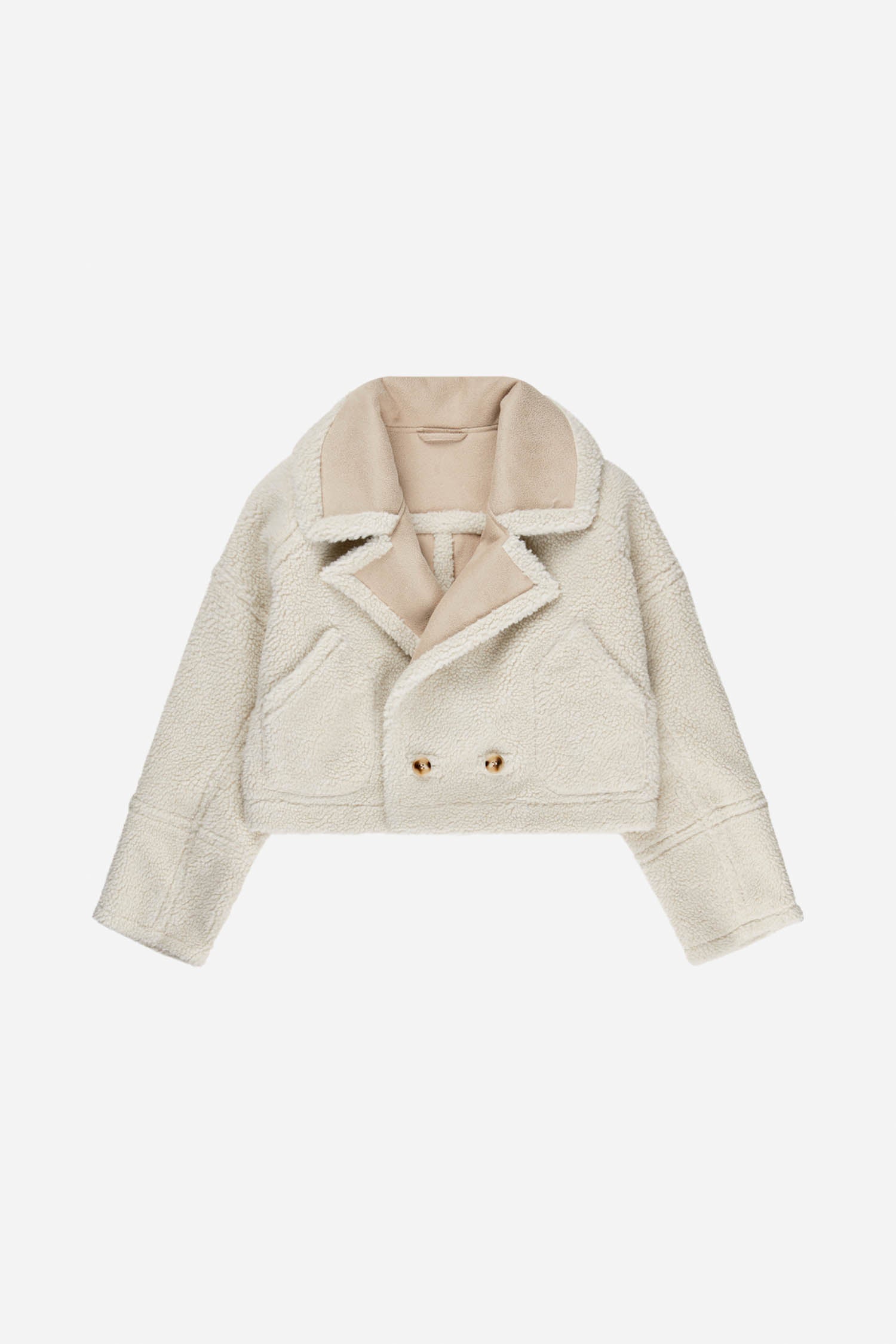 Vacker, beskuren teddyjacka designad för mångsidighet, med möjlighet att vända den ut och in för en subtil färgförändring. Har praktiska fickor och en elegant knappstängning framtill. Ett mysigt, iögonfallande lager med en lekfull twist.