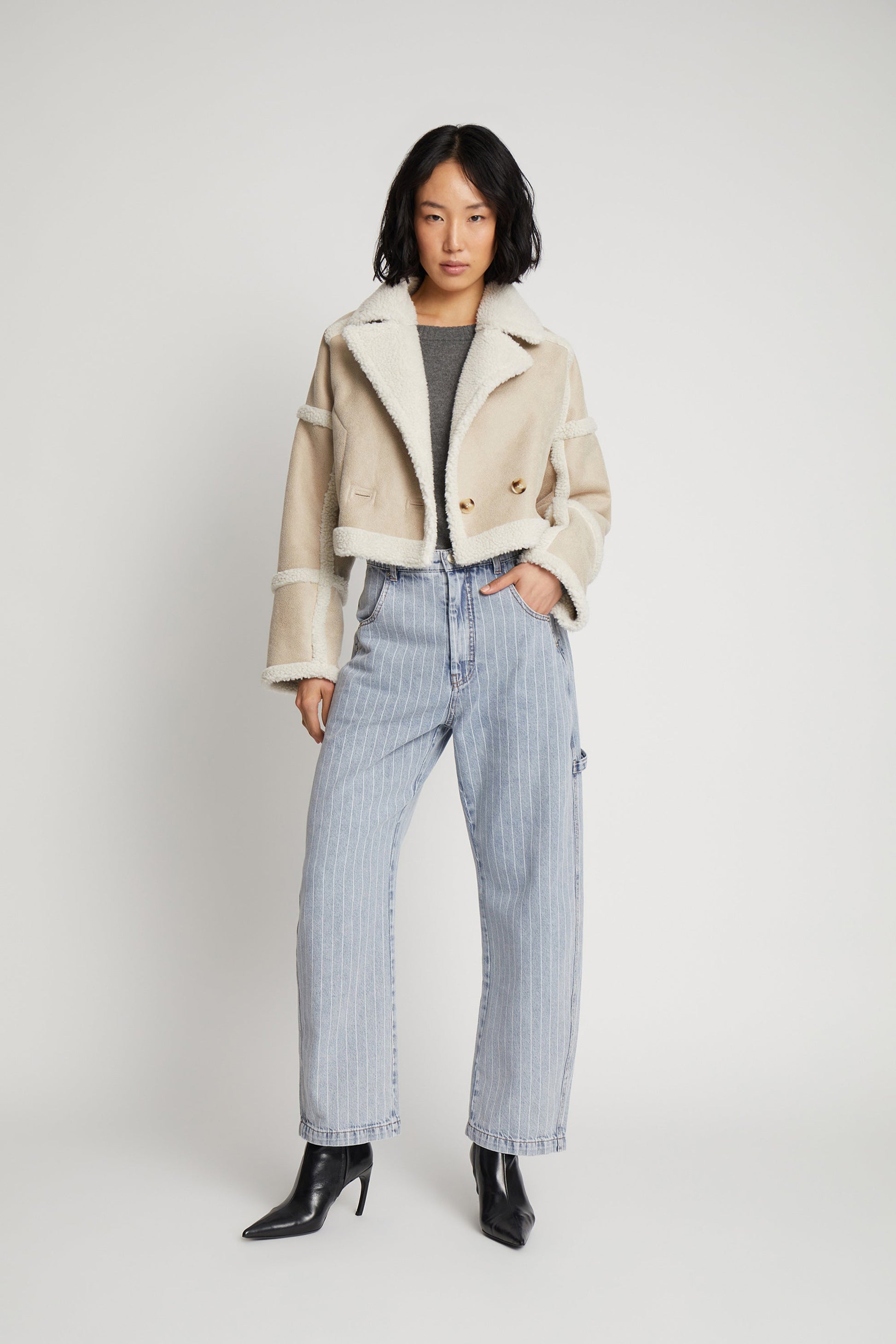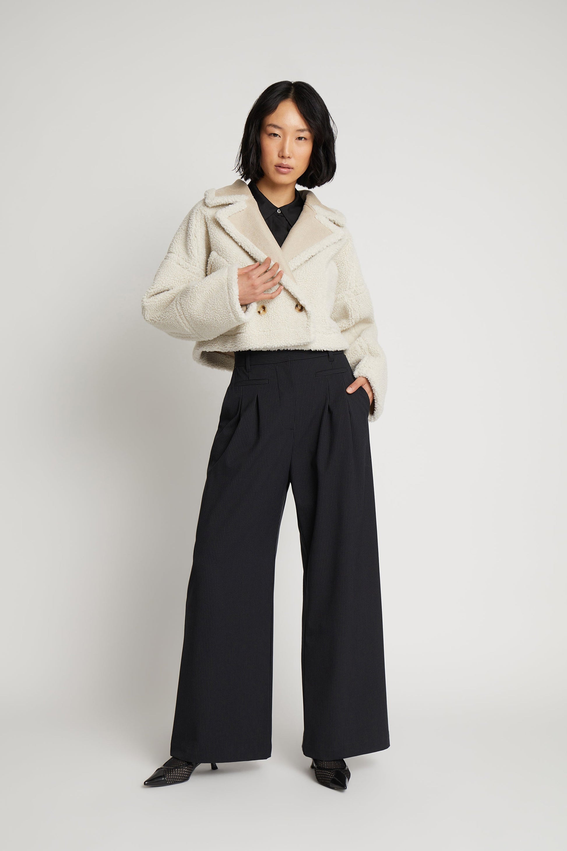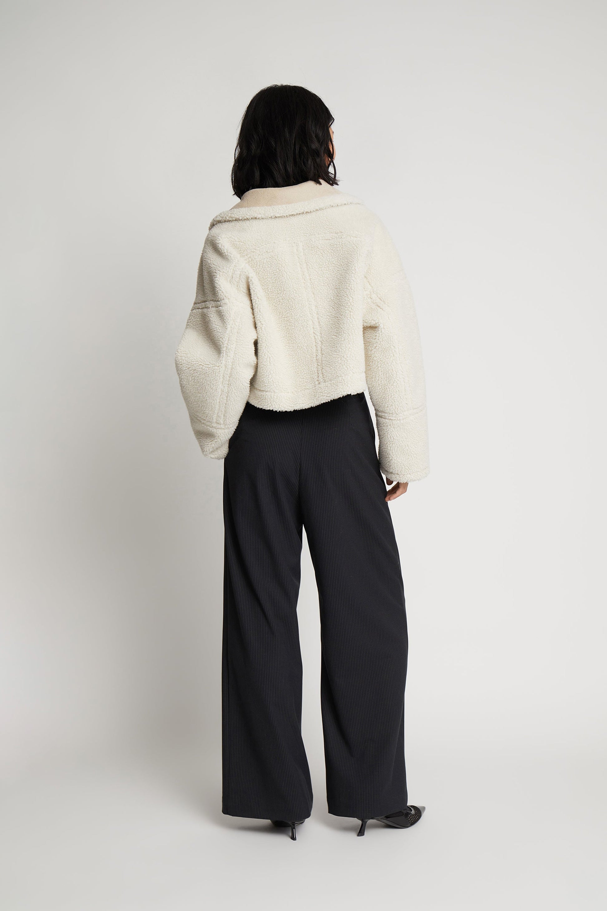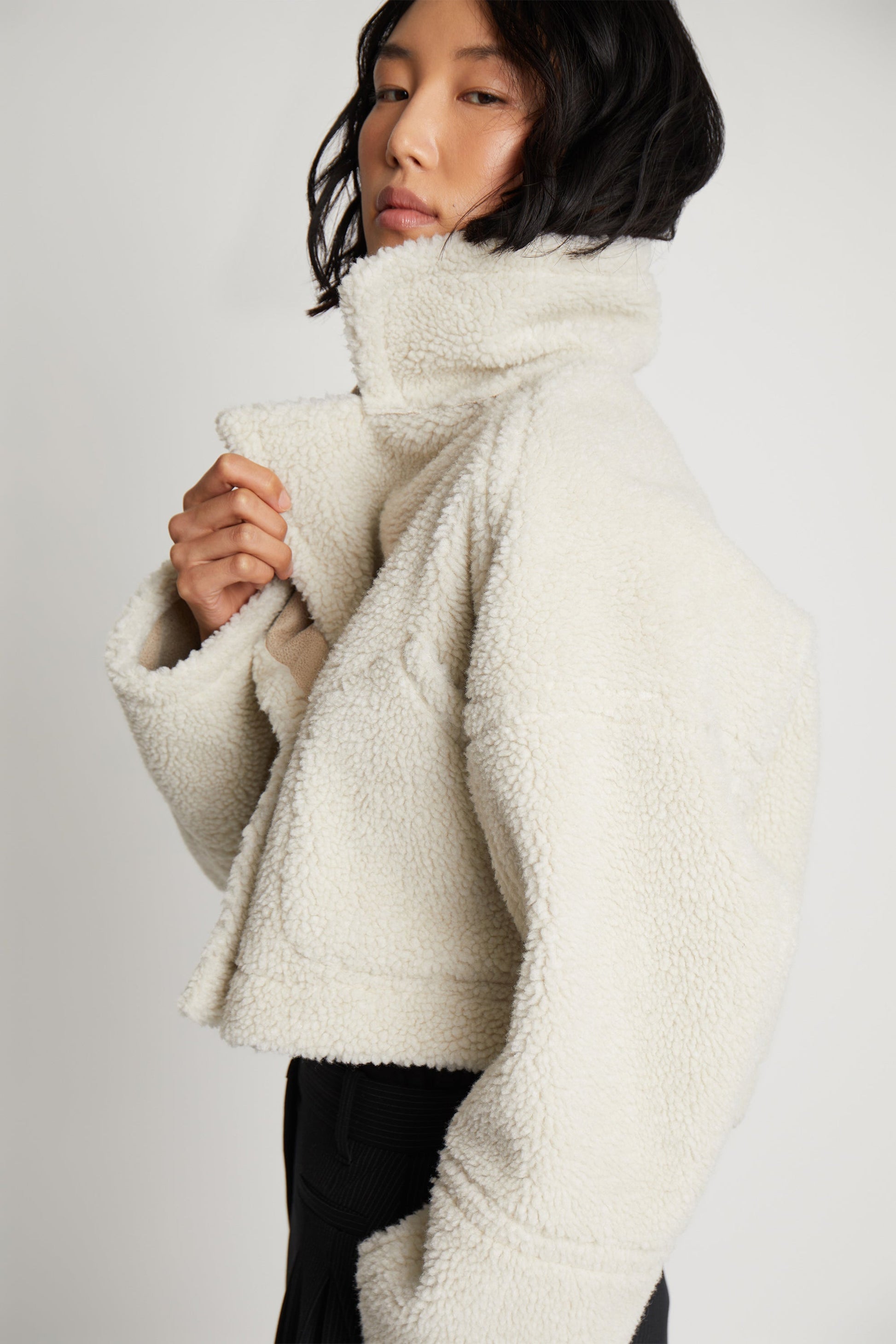 Vacker, beskuren teddyjacka designad för mångsidighet, med möjlighet att vända den ut och in för en subtil färgförändring. Har praktiska fickor och en elegant knappstängning framtill. Ett mysigt, iögonfallande lager med en lekfull twist.