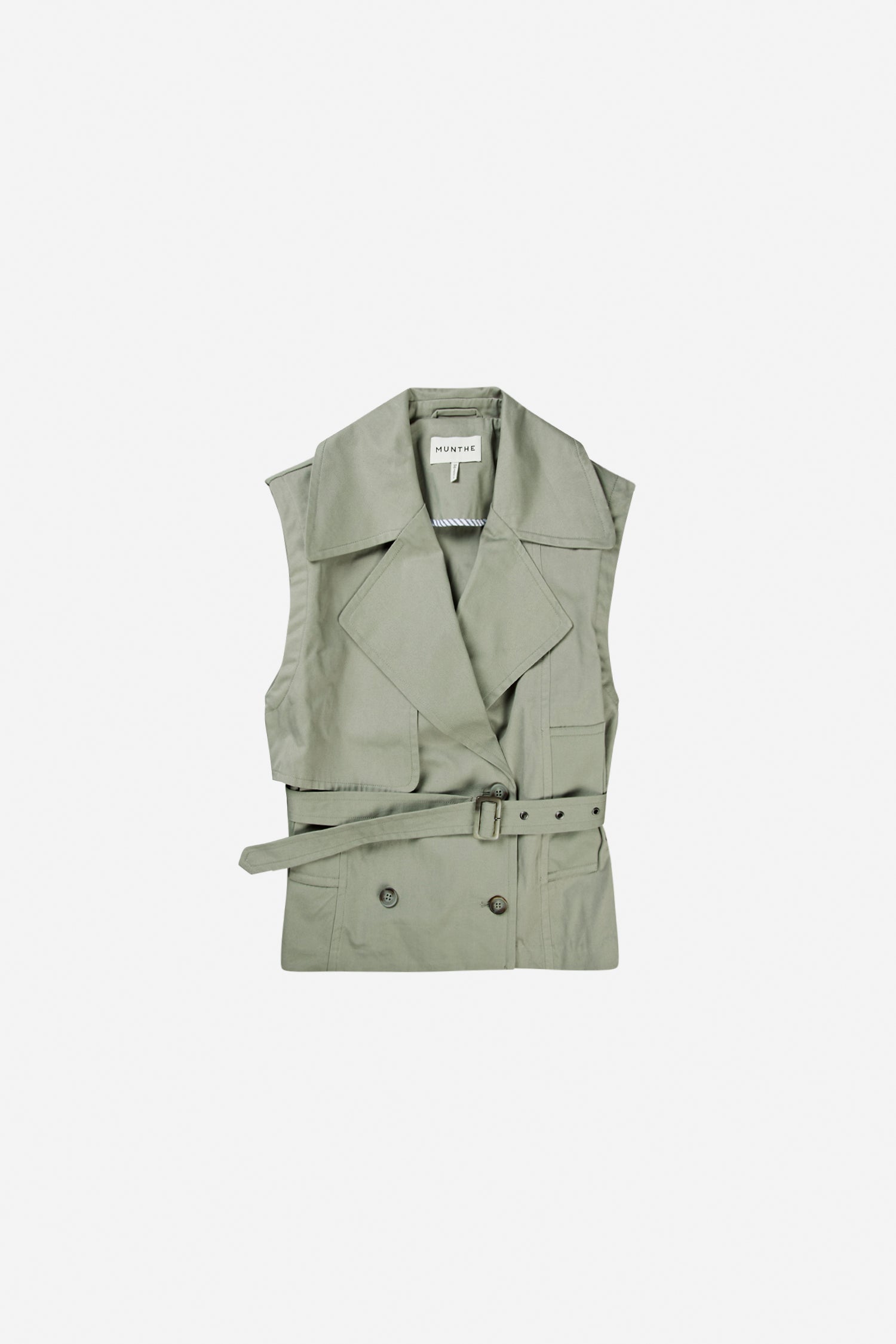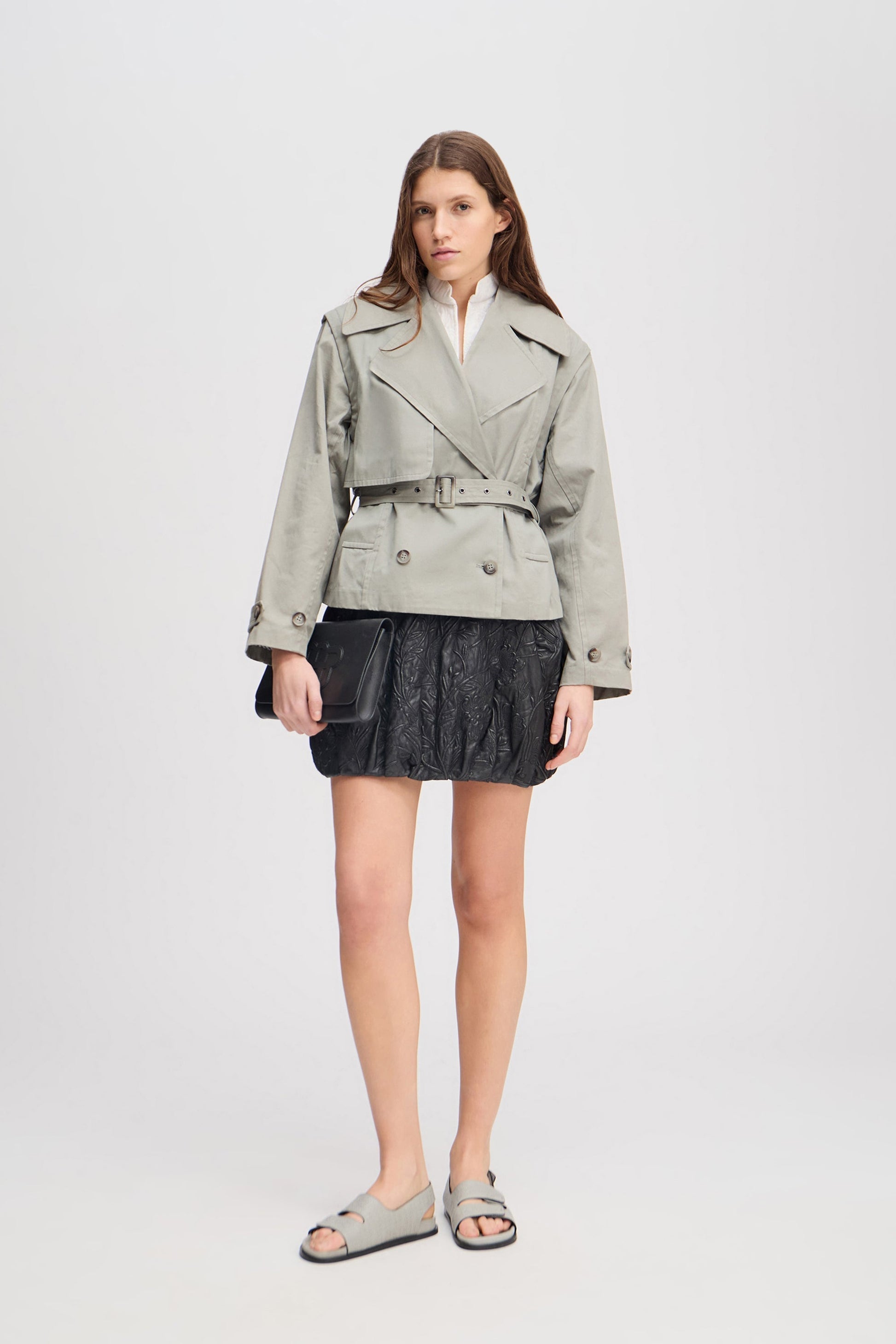 Mångsidig kort trenchcoat med ett smickrande skärp i midjan och praktiska sidfickor. Designad med avtagbara ärmar kan den enkelt omvandlas till en väst för anpassningsbar styling. Ett funktionellt men ändå snyggt ytterlager, perfekt för årstidernas växlingar.