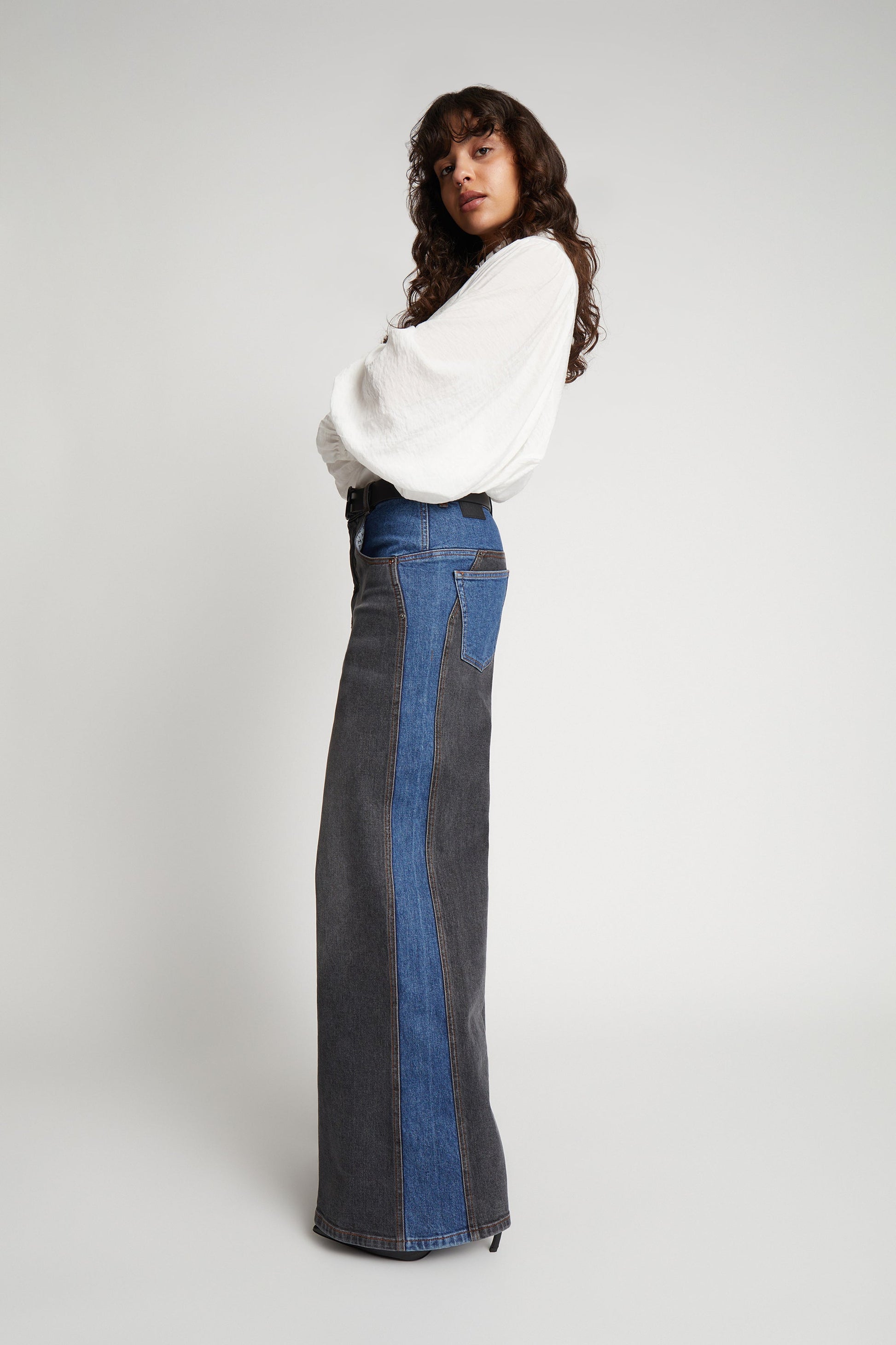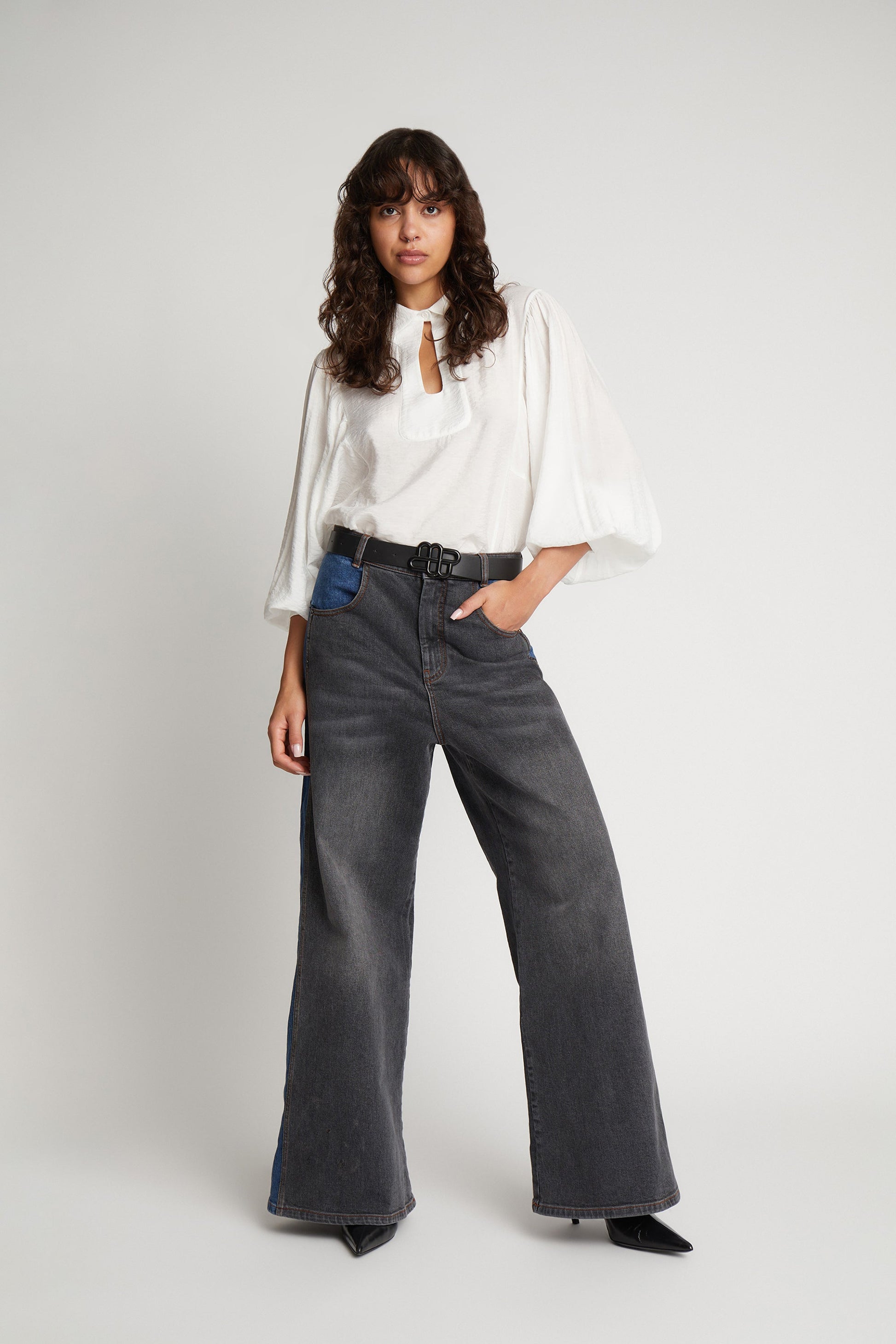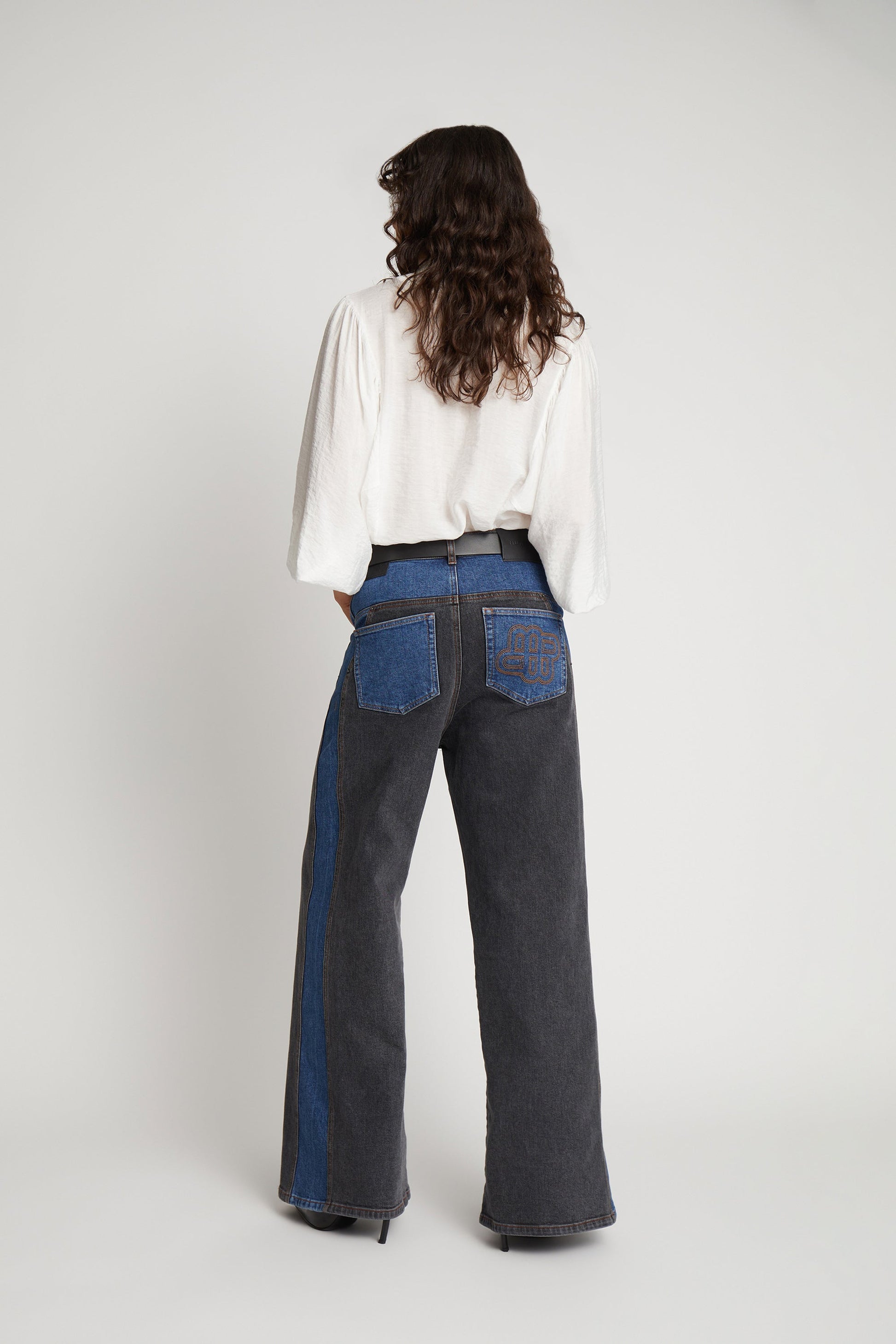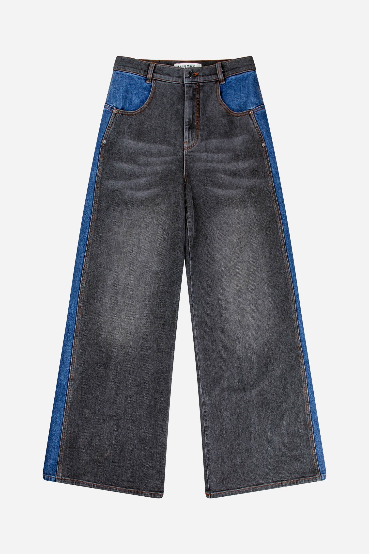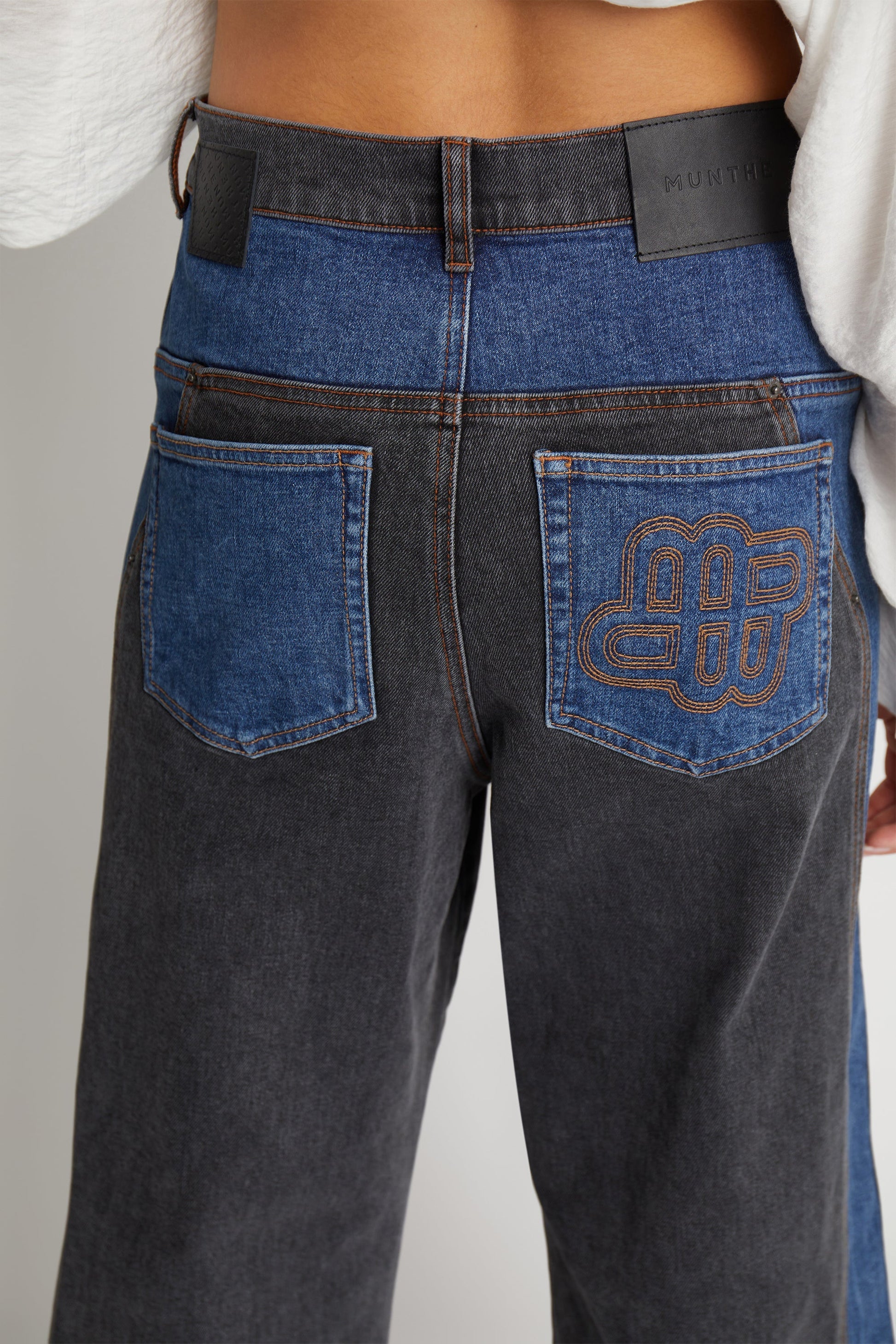 Eleganta tvåfärgade jeans med svart bas och kontrasterande blå rand längs sidorna, baksidan och fickorna. Designade med dragkedja och knappstängning framtill och tillverkade av en mjuk bomullsblandning, ger dessa jeans en modern twist på en klassisk silhuett.