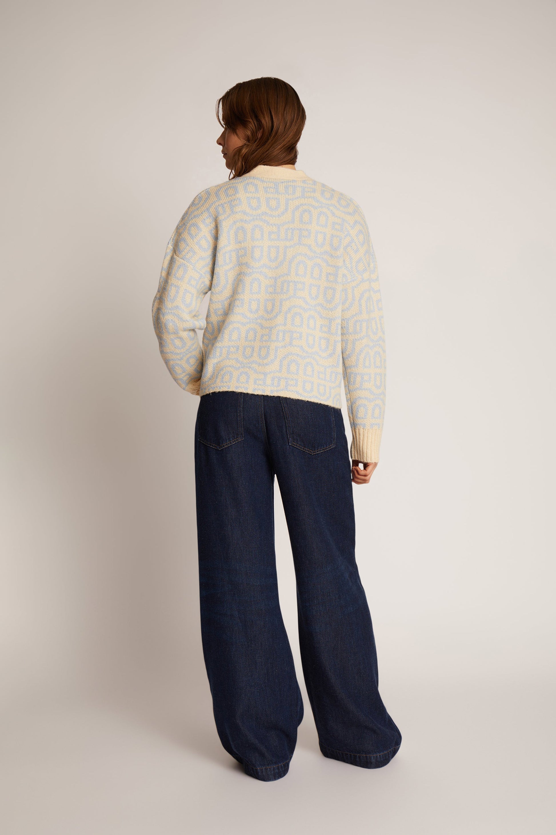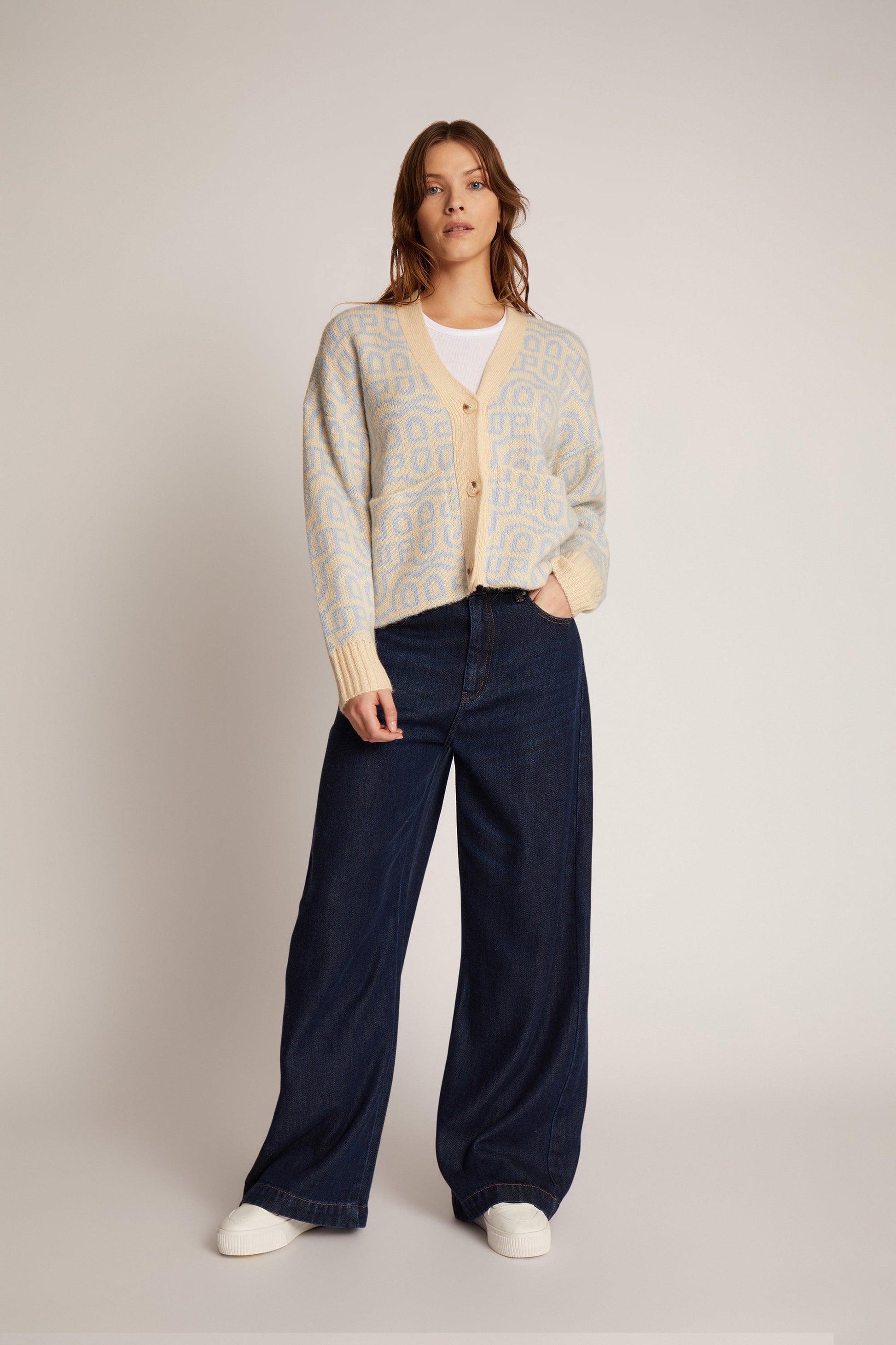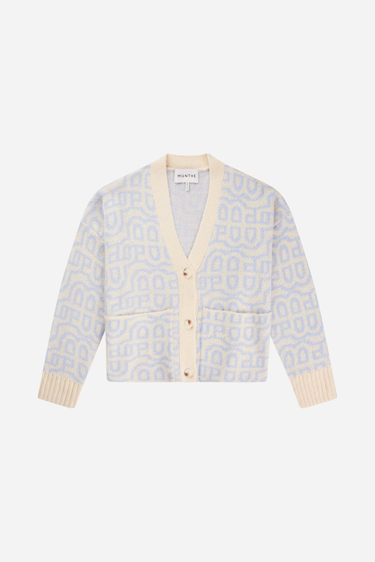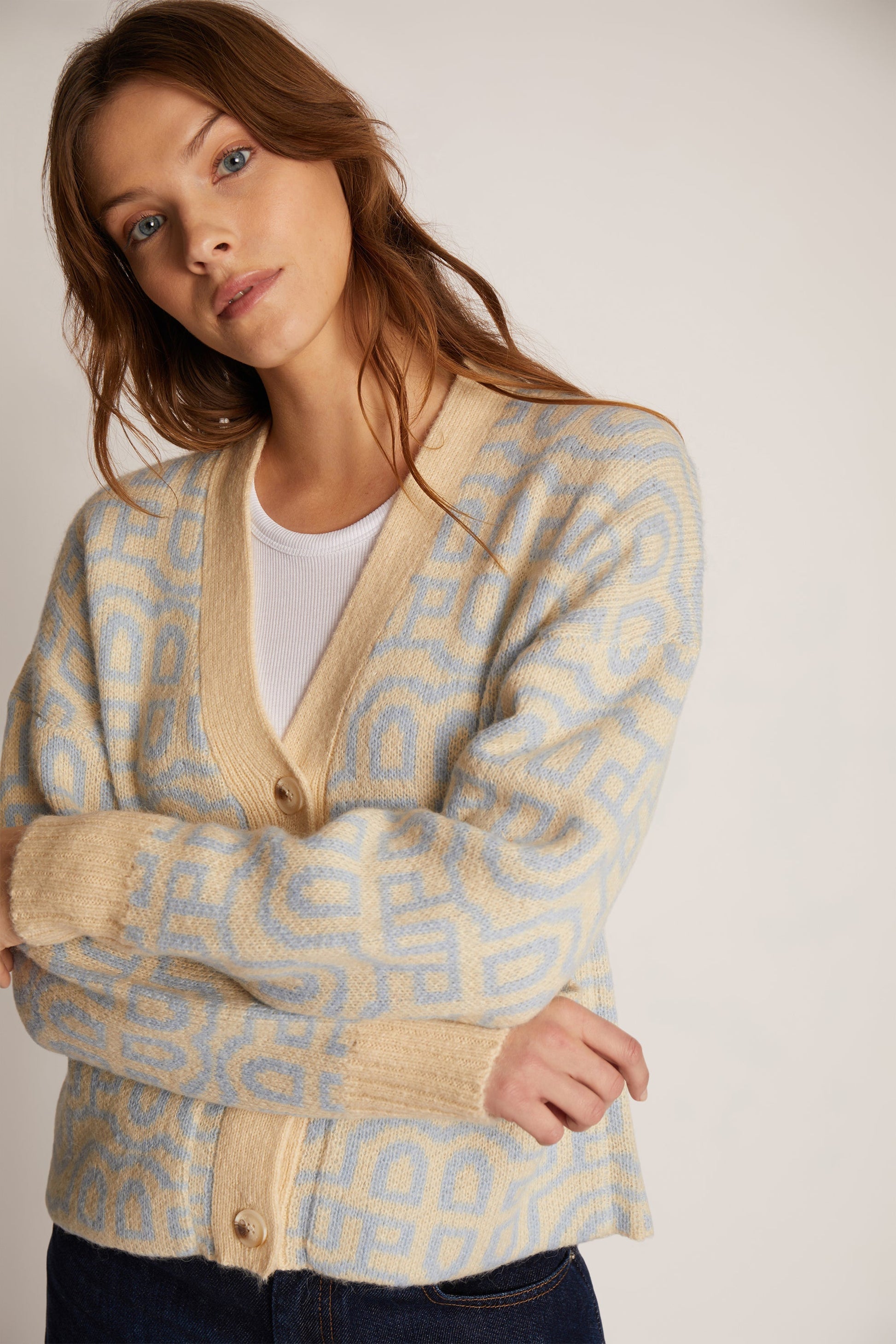 Mjuk stickad kofta med ett vackert heltäckande emblemtryck, designad med nedhängda axlar, framfickor och ribbade ärmslut. Tillverkad för en normal passform, erbjuder detta plagg både komfort och karaktär i en mångsidig silhuett.