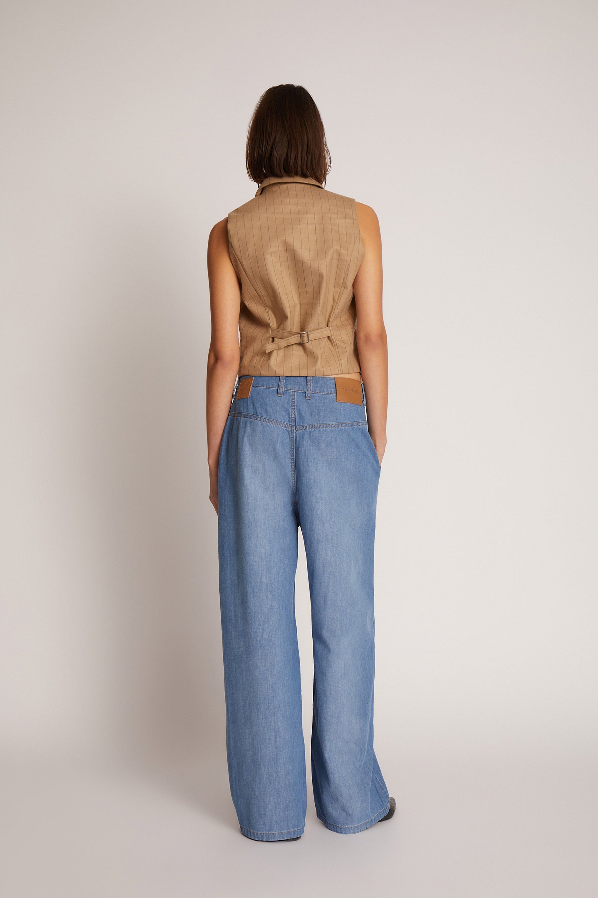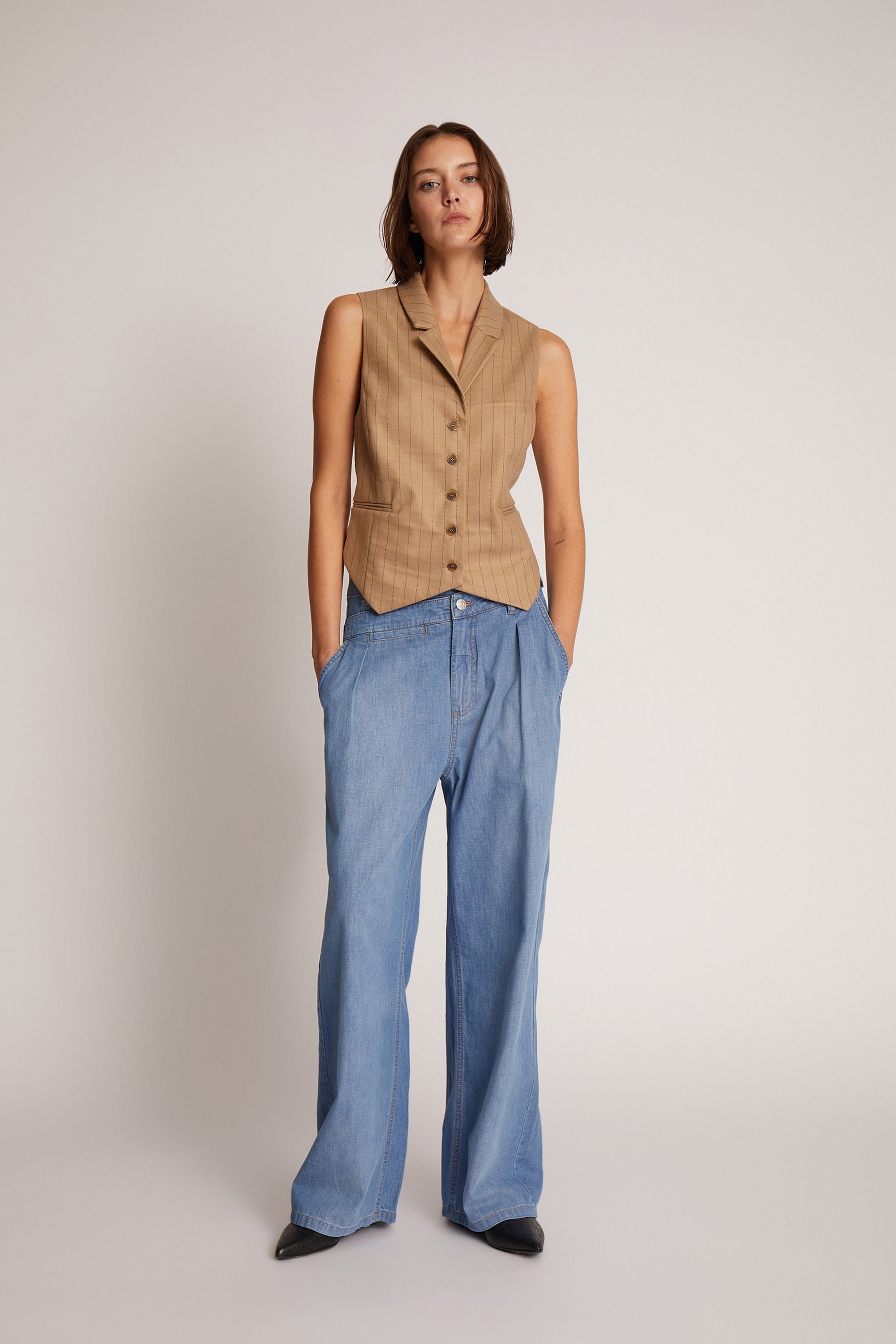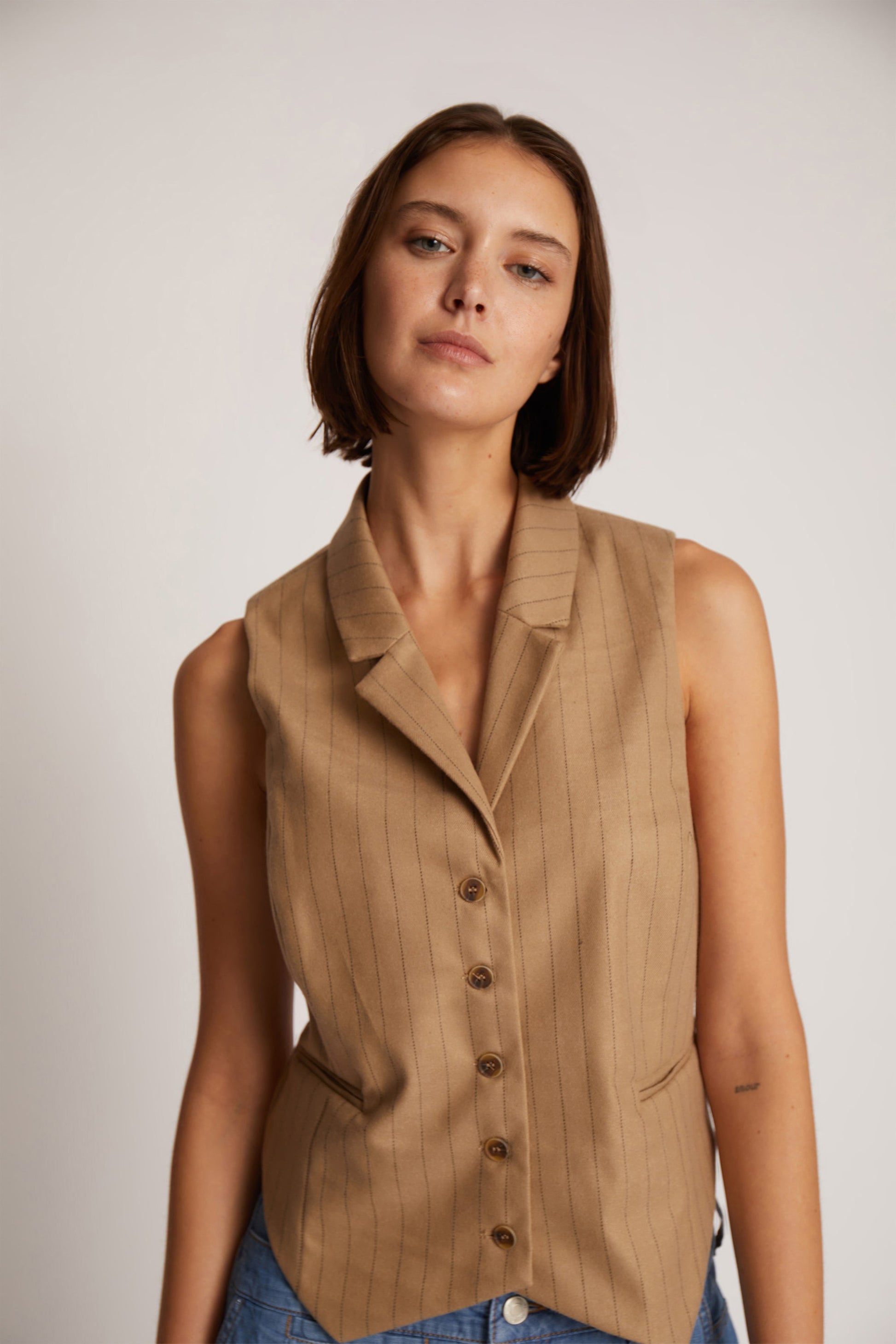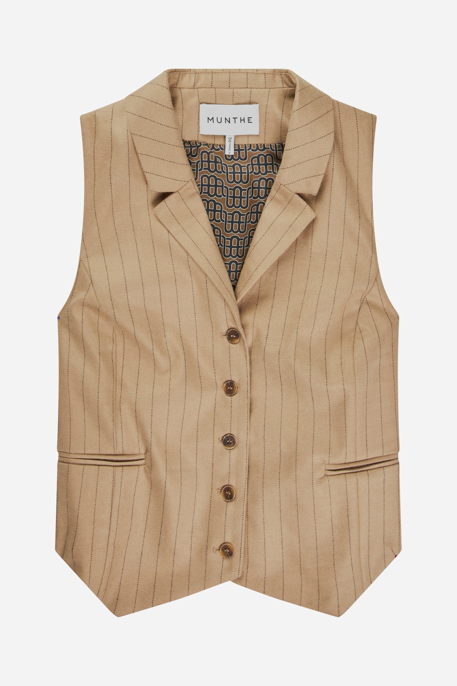 Figursydd väst med eleganta kritstreck, tillverkad av en återvunnen polyesterblandning. Designad med framfickor och en klassisk knappknäppning, erbjuder detta skräddarsydda plagg ett snyggt och mångsidigt tillskott till vilken lager-på-lager-look som helst.