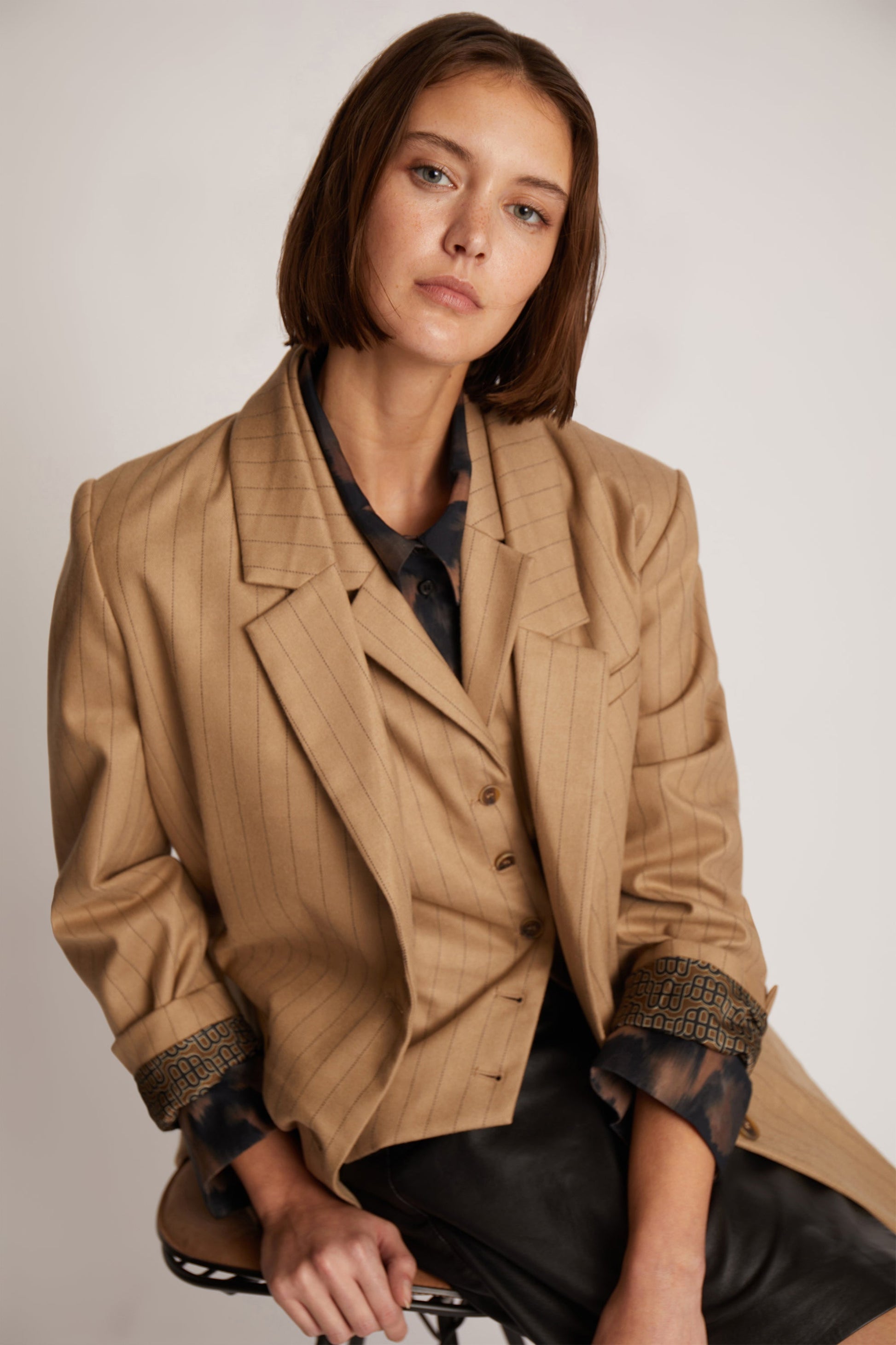 Finns i färgerna kamel och svart. Modellen är 176 cm lång och bär storlek 36.